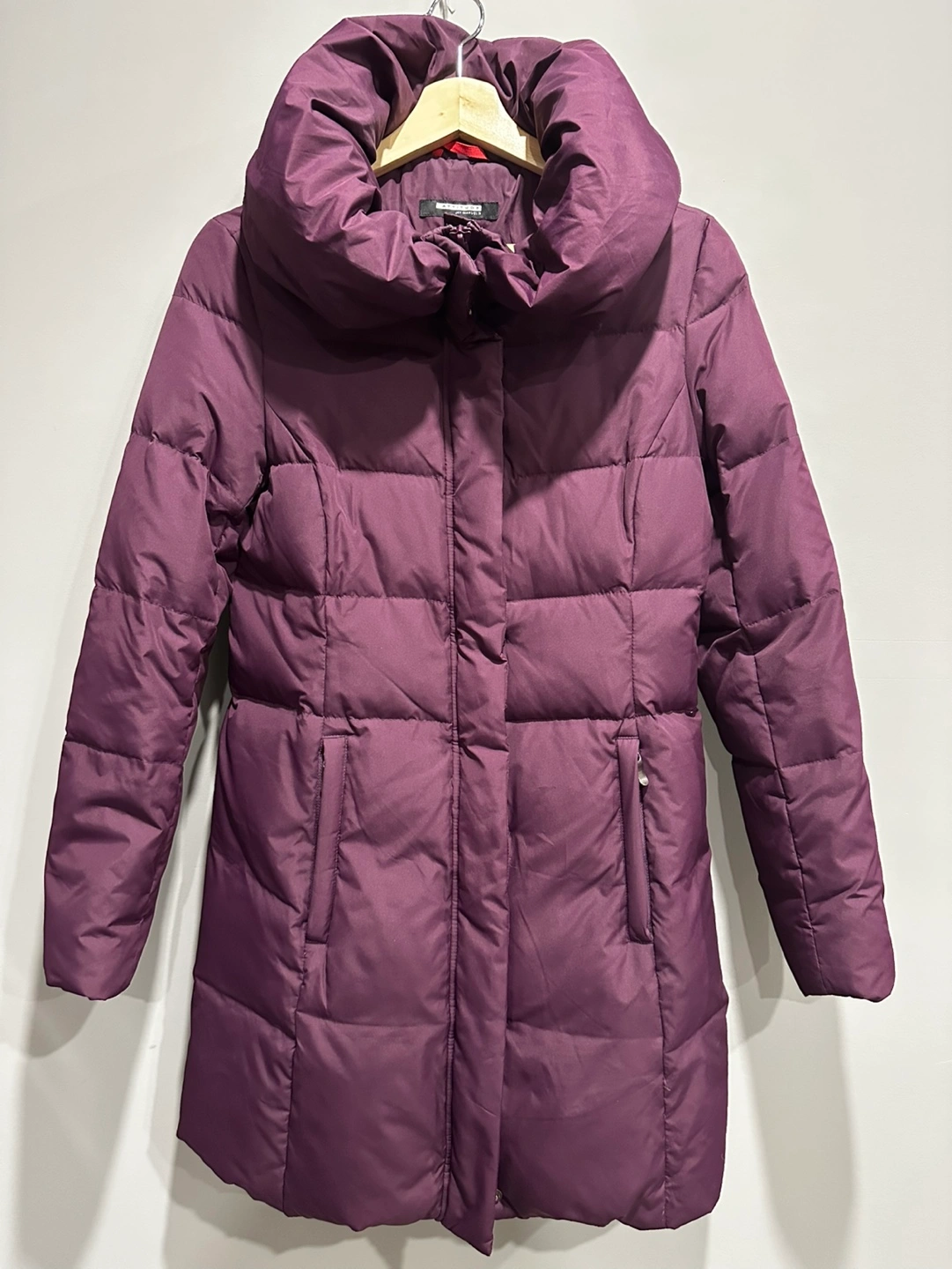 Long-length quilted puffer coat. Features a large collar. Zipper closure. Side pockets. Great for cold weather. Filler 50% down, 50% waterfowl feather.