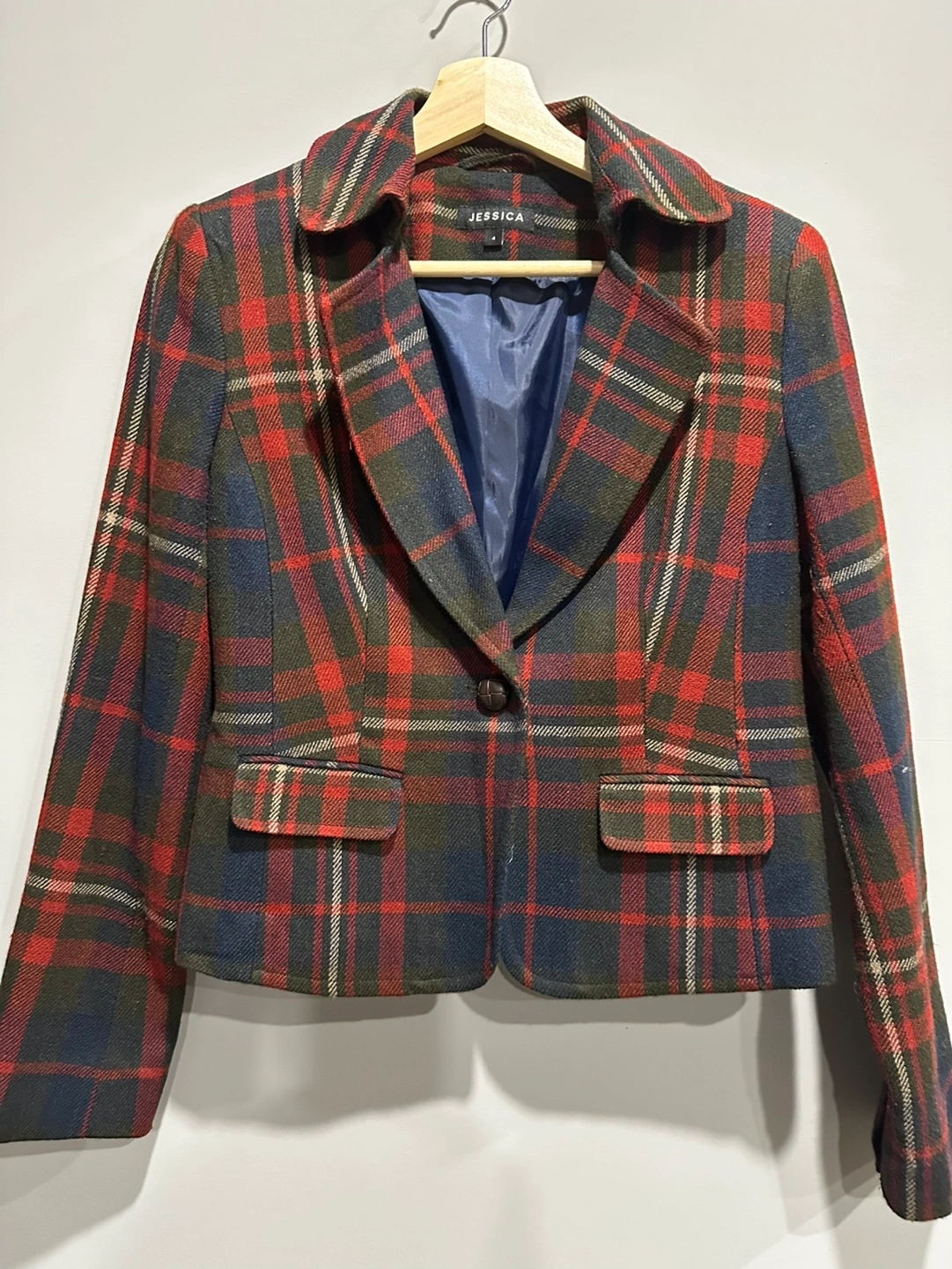 Women's cropped blazer. Red, green, and navy plaid pattern. One button closure. Long sleeves. Two front pockets. Shell 100% acrylic.