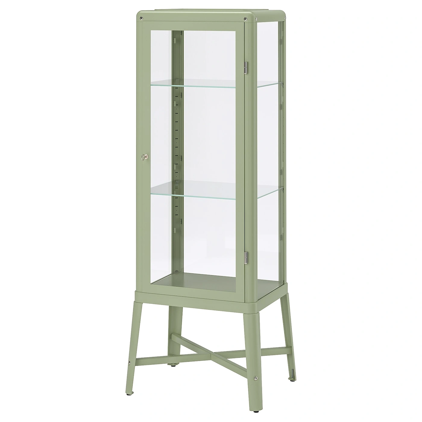 Metal display cabinet. Two glass shelves. Sage green finish. Simple, modern design. Sturdy stand.