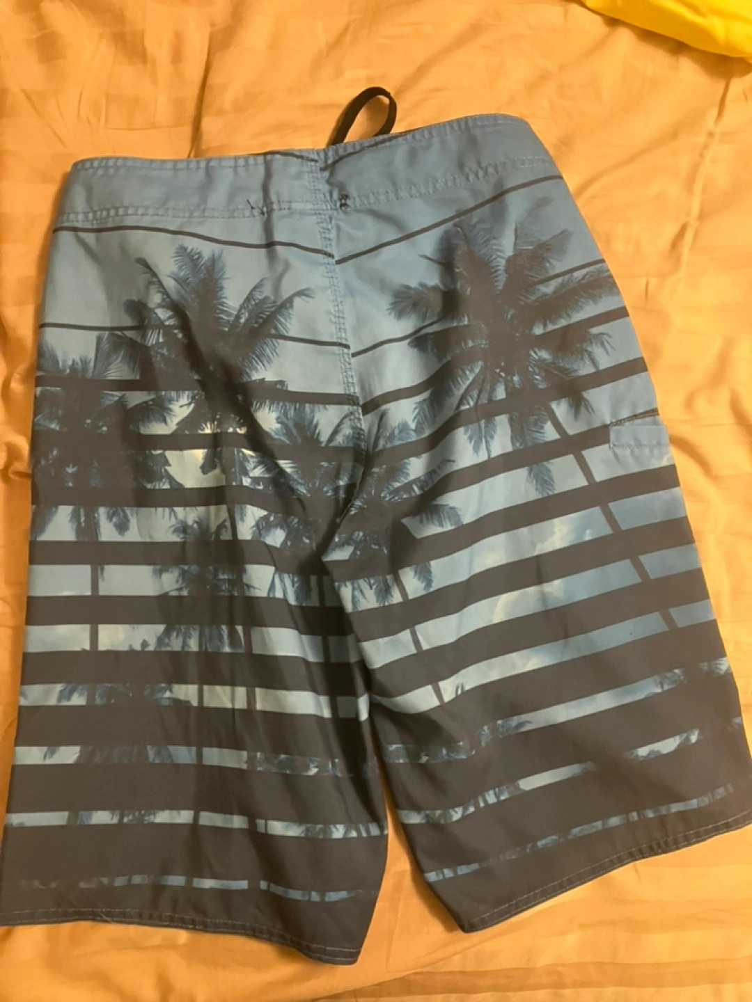 Men's swim trunks, blue with palm tree print. Size 32. Drawstring closure. Side pockets. Great for summer.