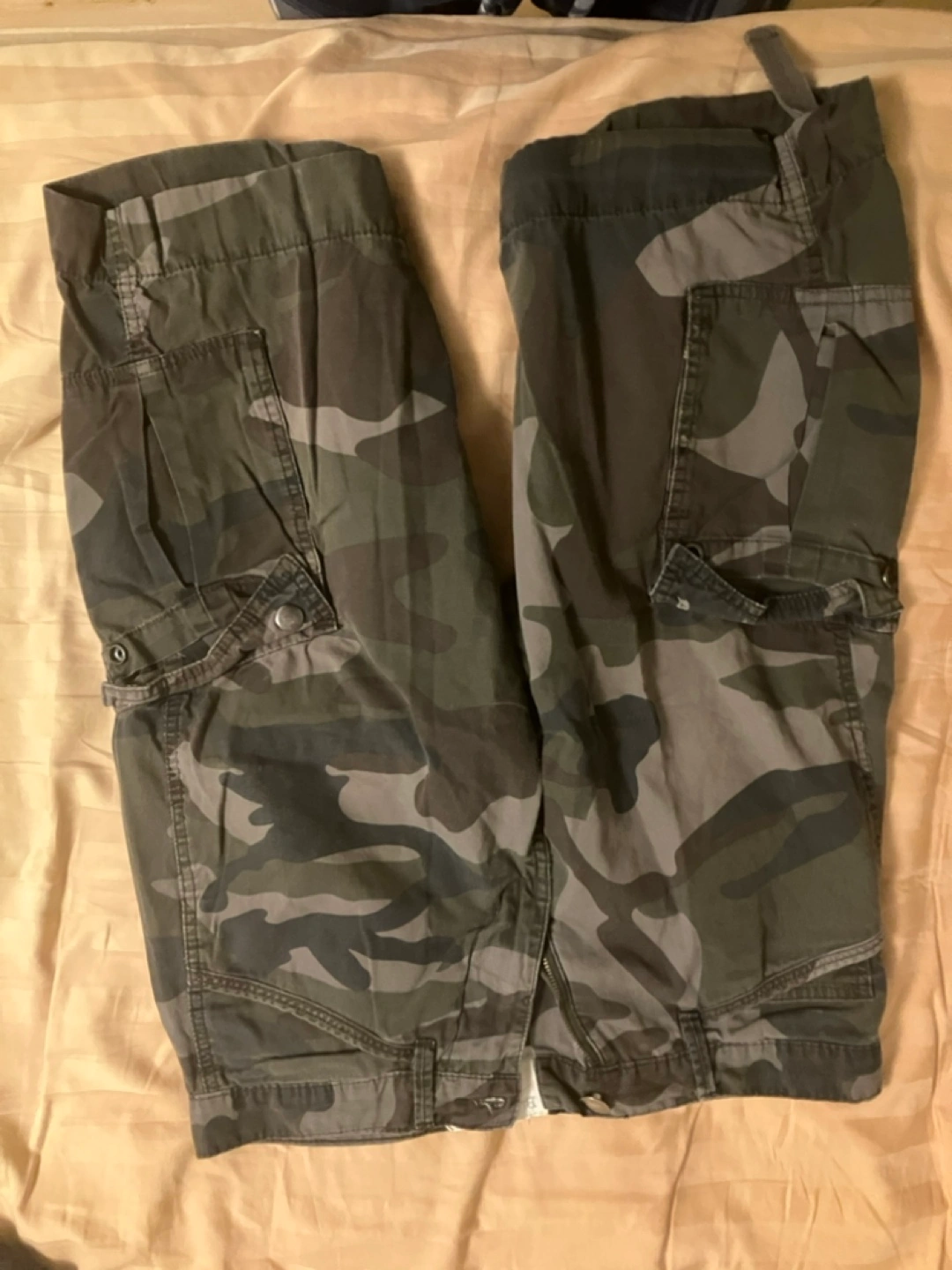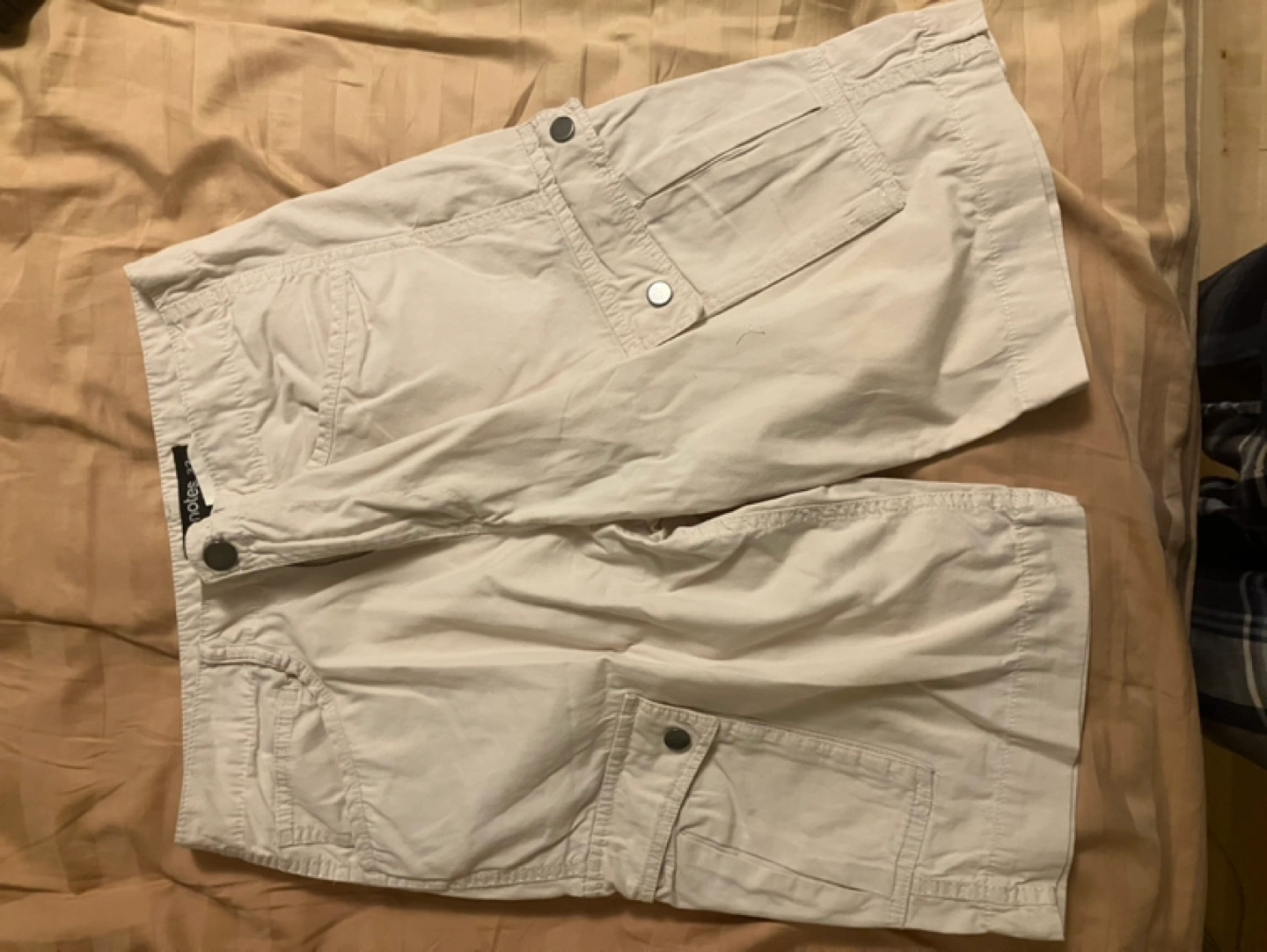 Five pairs of men's cargo shorts. Variety of colours and styles. Multiple pockets. Good for casual wear.
