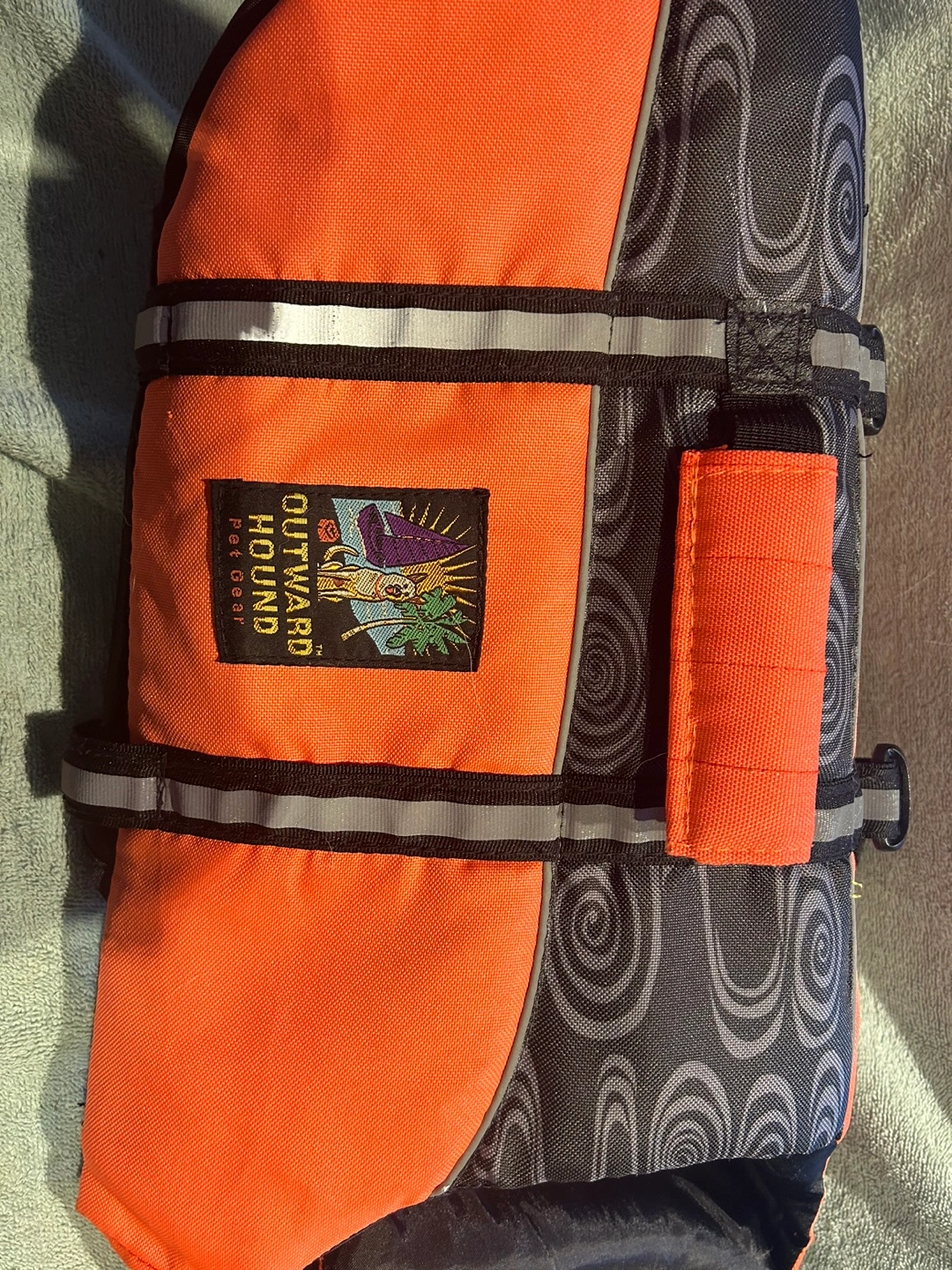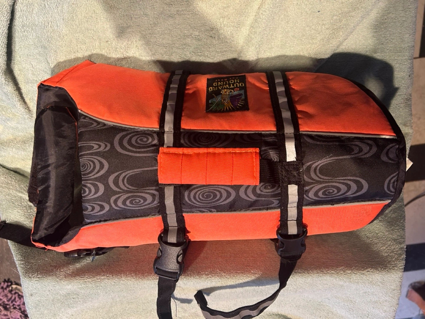 Orange and black dog life vest. Features adjustable straps and reflective strips. Suitable for water activities. 14” long 27-35” girth