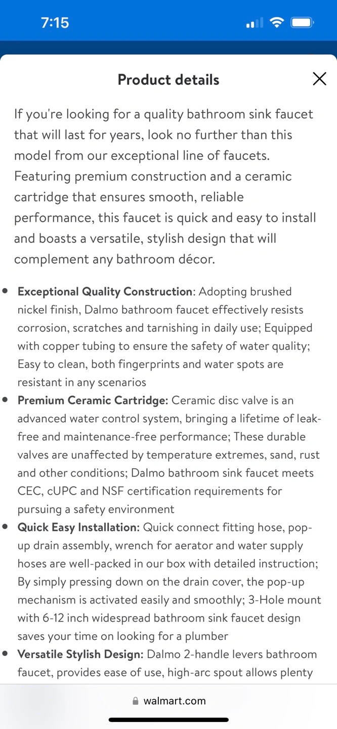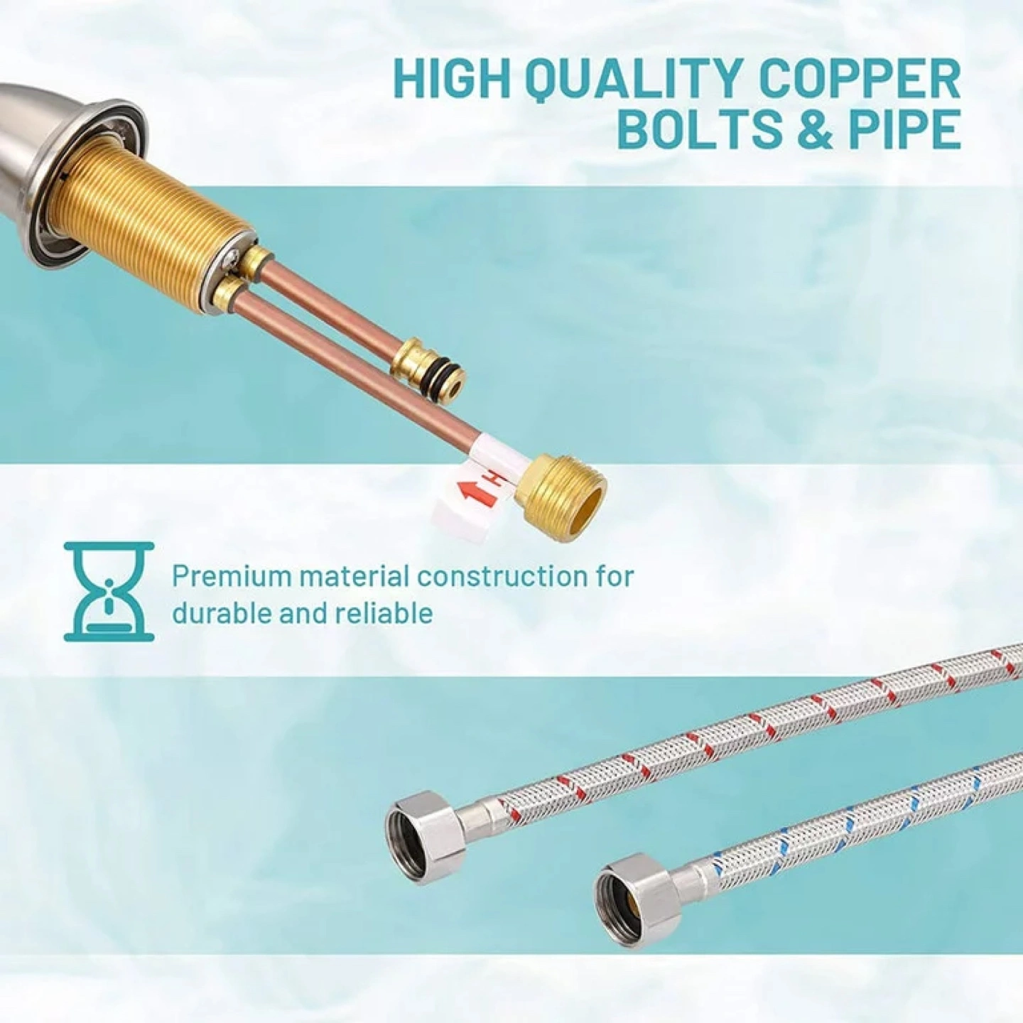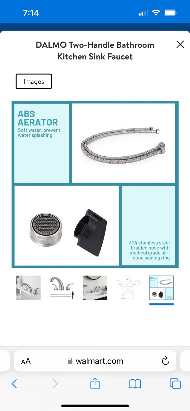 New Dalmo bathroom sink faucet. Brushed nickel finish. Includes hot and cold water supply hoses, pop-up drain with overflow, quick connect fitting hose, and wrench. Easy installation. Three-hole design. High-arc spout.