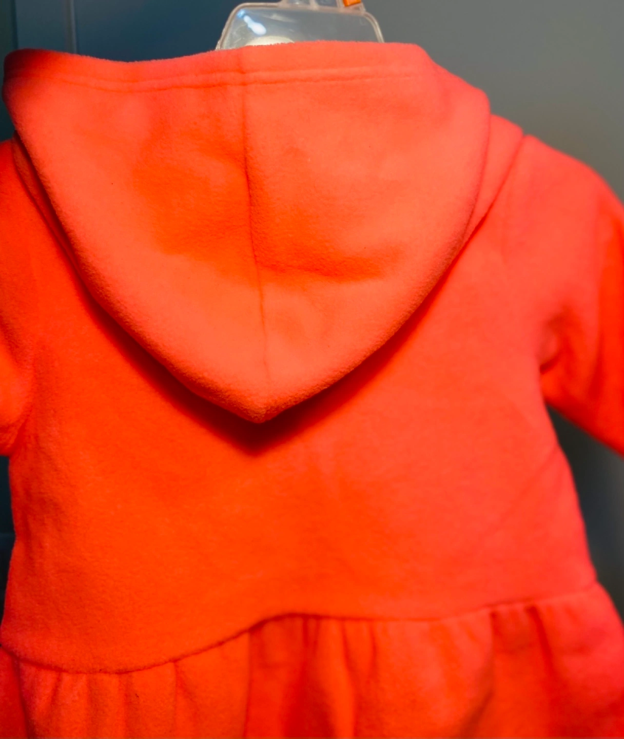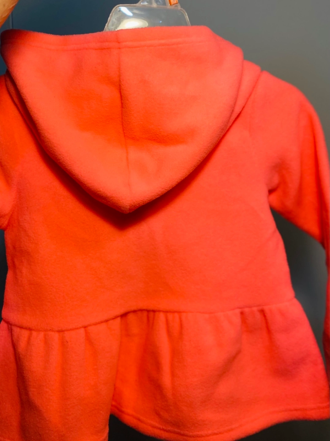 Adorable coral pink fleece zip-up hoodie. Features a hood and a cute ruffled hem. Great for layering or wearing alone. Size 3T.