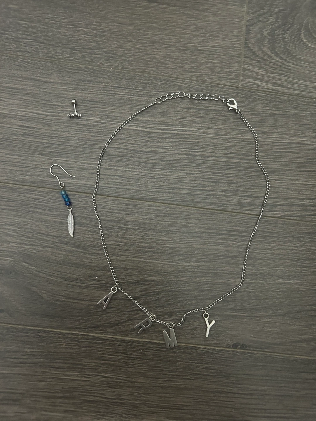 Adorable silver-toned jewelry set. Includes a delicate ARMY necklace, and the earrings. Perfect for fans or anyone who appreciates unique jewelry. All pieces appear to be made of metal.