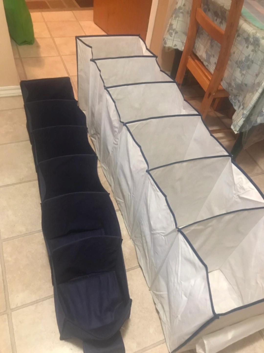 50Set of two fabric closet organizers. One navy blue, one off-white. Multiple compartments. Great for clothes, shoes, or other items.
