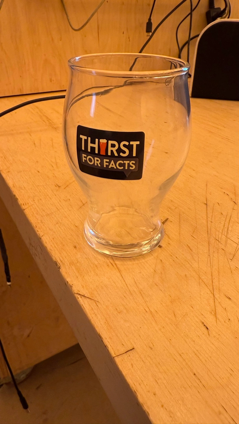 119Clear glass. Features a Thirst for Facts sticker. Great for beer or other beverages.