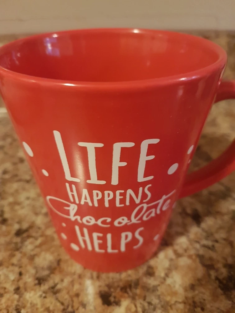 Large red ceramic mug. Features the saying "Life Happens Chocolate Helps" in white lettering. Microwave and dishwasher safe.