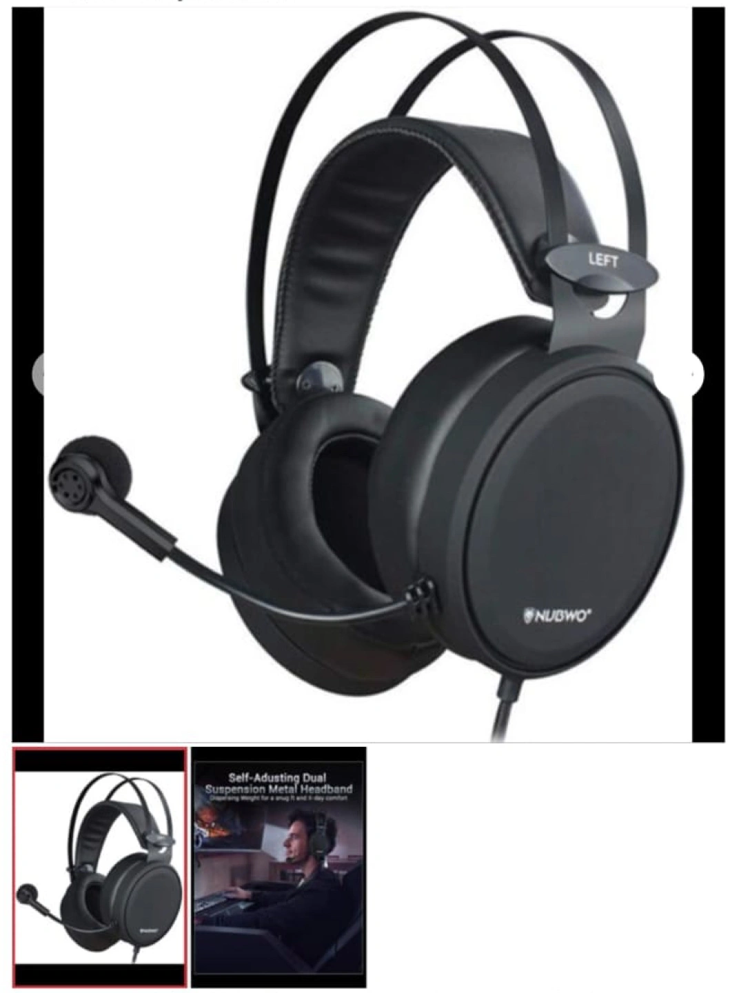 Black wired gaming headset. Over-ear design. Features a microphone. Self-adjusting dual suspension metal headband.