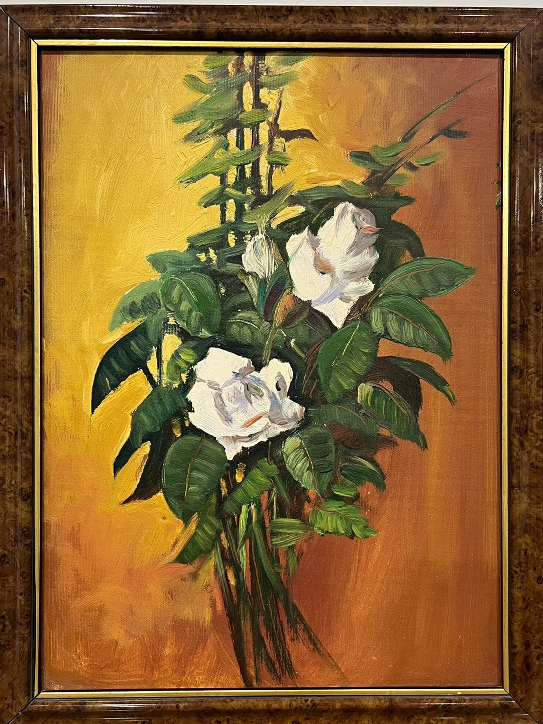 145Beautiful oil painting of white roses in a dark brown frame. A vibrant, colourful piece. Looks great on a wall.