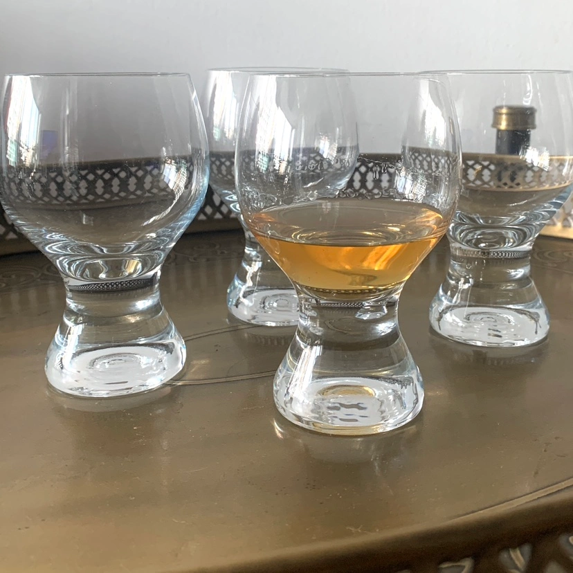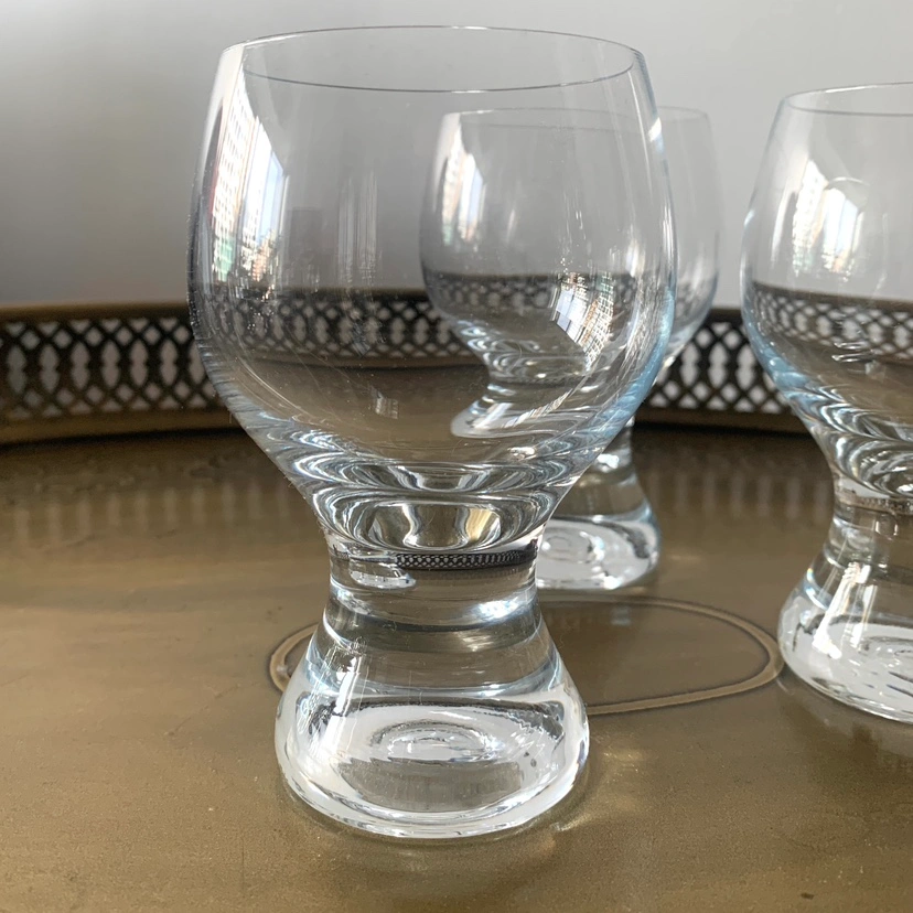 Clear glass tumblers with a bulbous bowl set on top of a short, sturdy stem. Unique design, is perfect for drinks, whisky, dessert wines or to serve sorbets / ice cream. Light-weight. Great condition.
