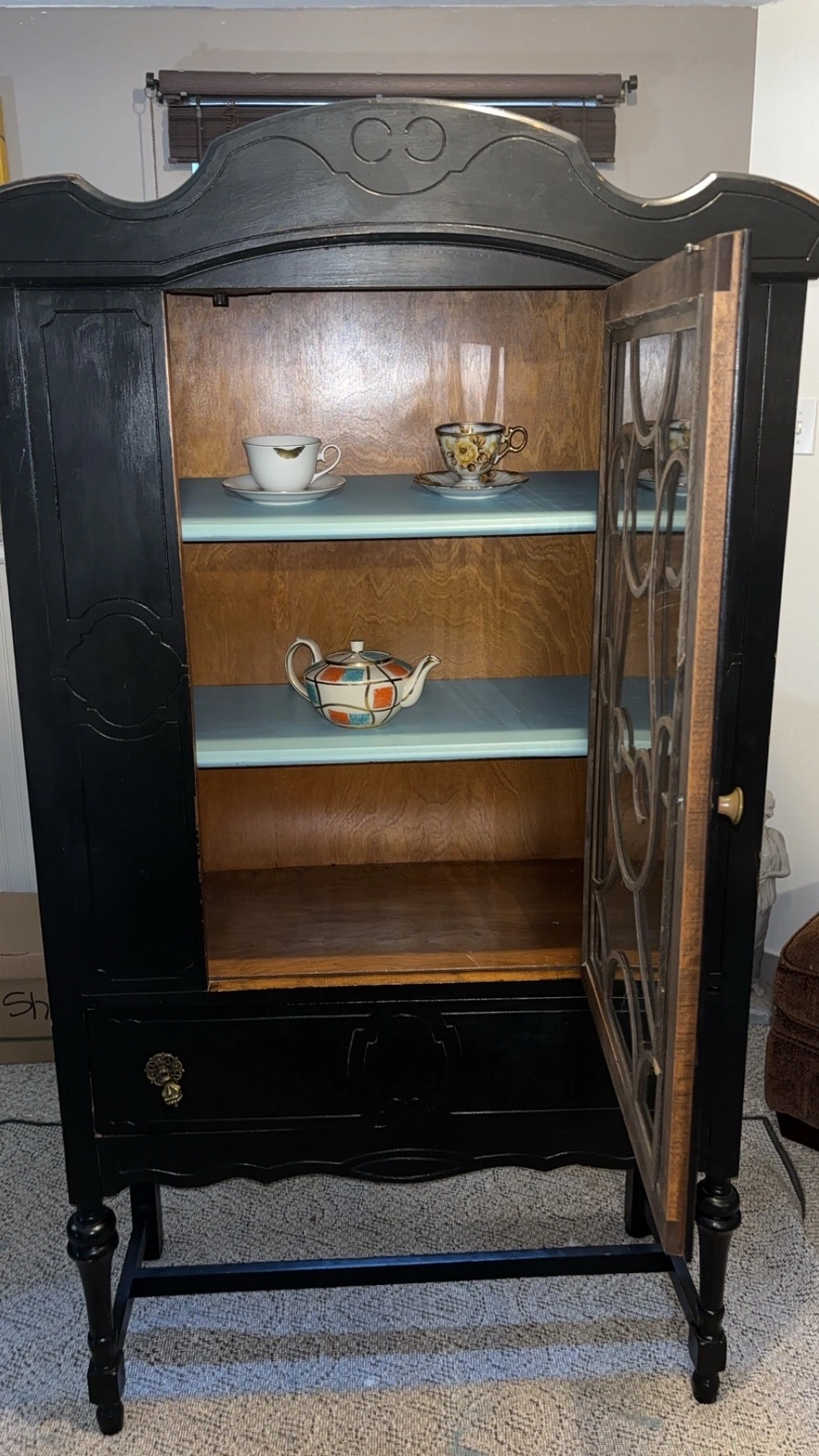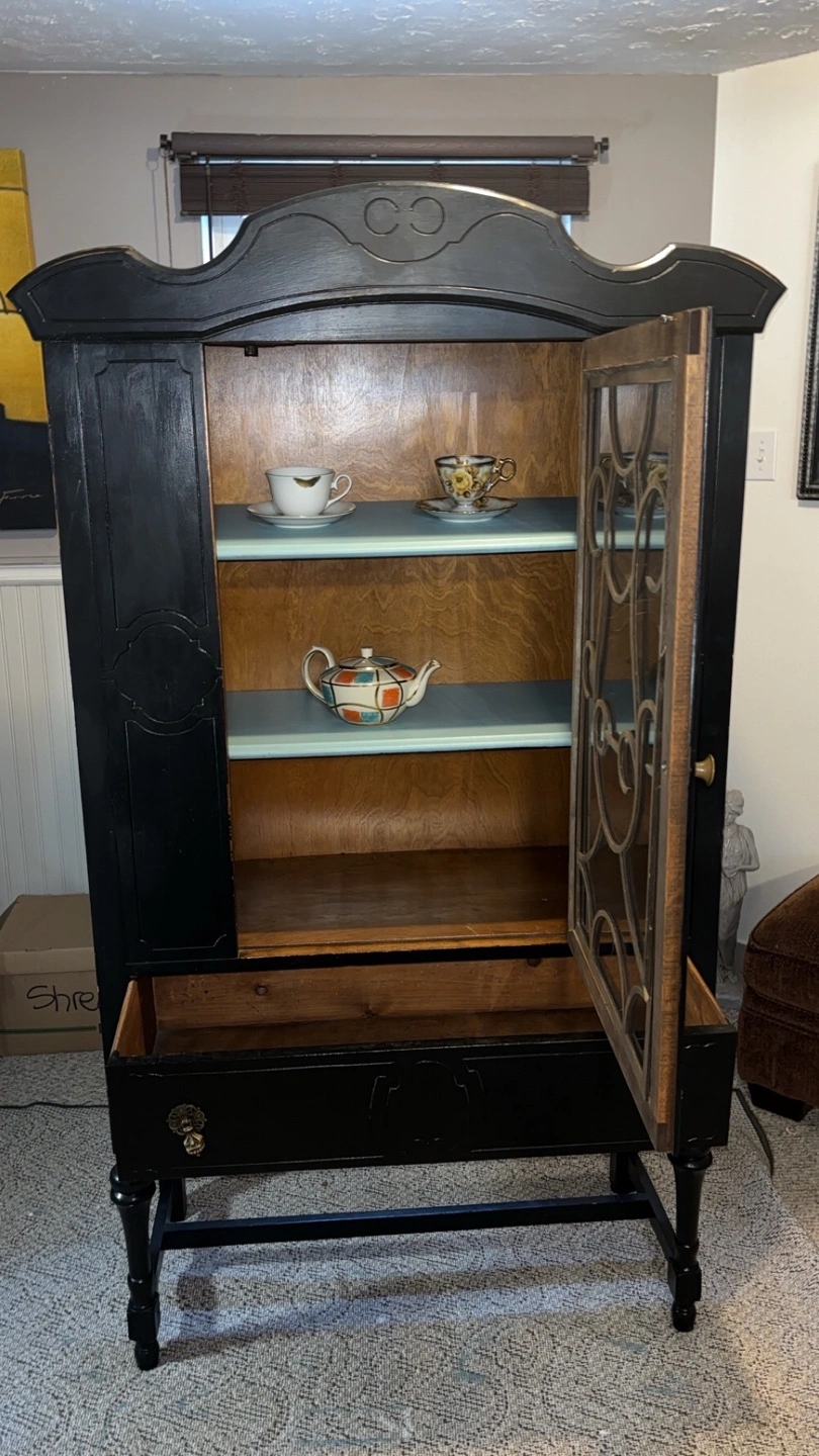 Stunning antique china cabinet that adds elegance to any room! This black cabinet features painted fusion blue panels with colour hairloom, a glass door, two spacious shelves, and a bottom drawer, perfect for displaying your favorite collectibles. Decorative engraved design and gold-colored hardware. It’s in excellent condition and ready for a new home.