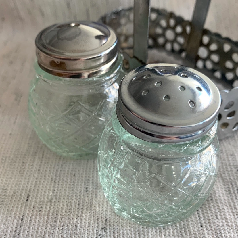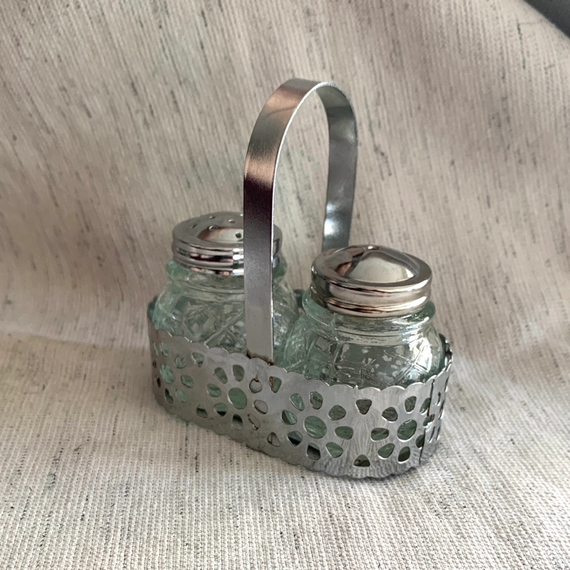Adorable mini vintage salt & pepper shakers. Glass containers with metal lids. Displayed inside a metal stand with a carrying handle. Floral cutout motif on stand. Perfect for a charming kitchen or brunch setting. Shakers: 5.5cm x 4cm Carrying Stand: 9.5cm x 10cm x 5cm Available for pick-up (corner Laurier Ave W. / Lyon) Cash only - (e-transfers NOT possible).