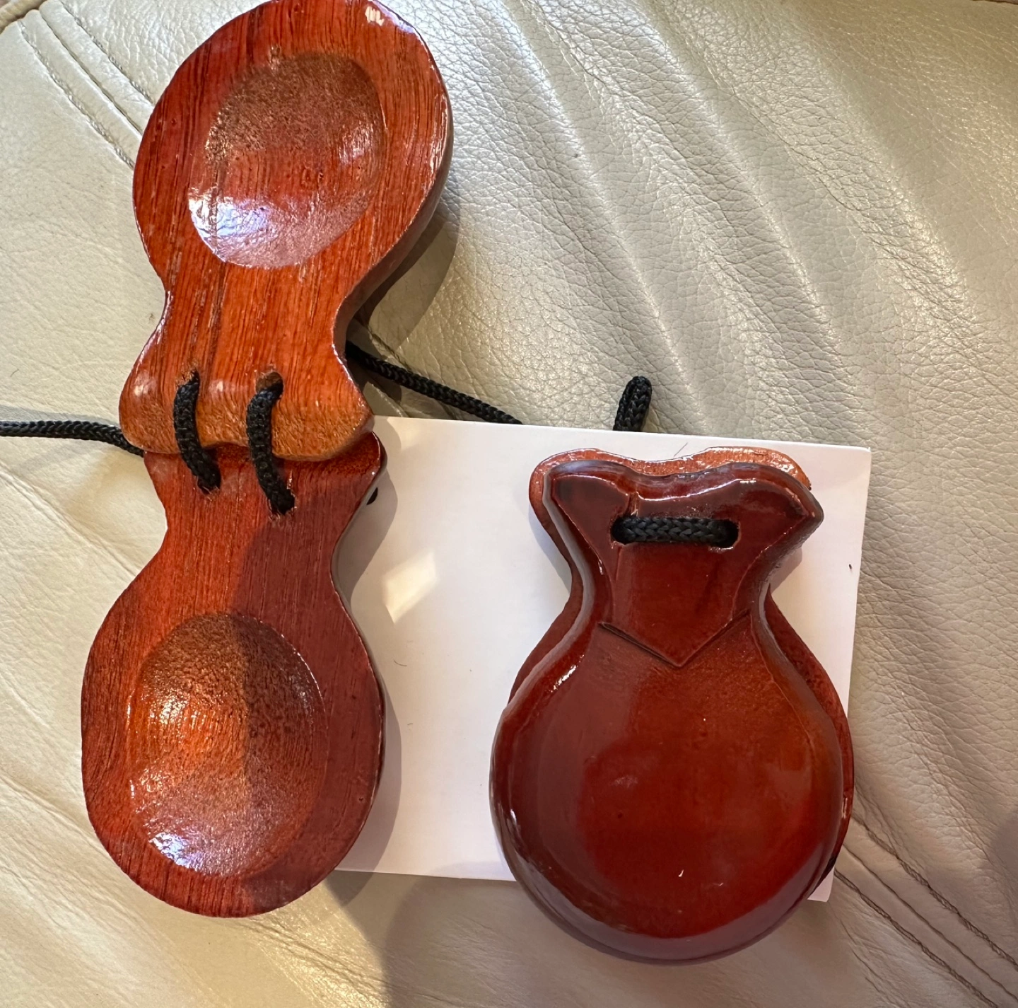 Two pairs of wooden Spanish castanets with string. Special accessories for flamenco dancing or other musical performances.