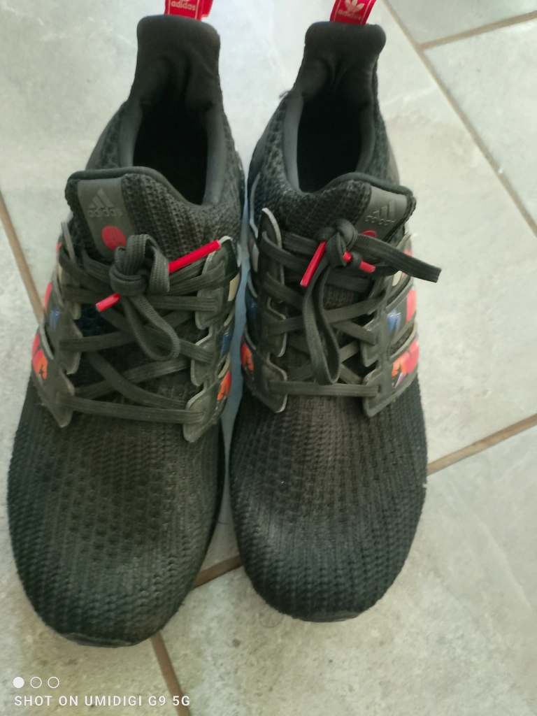 Adidas Ultraboost DNA CC_1 running shoes. Black colourway with colourful accents. Pre-owned, some wear.