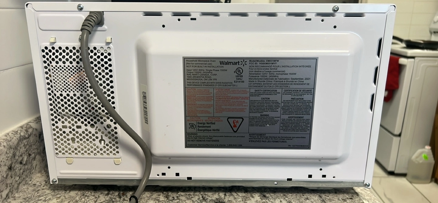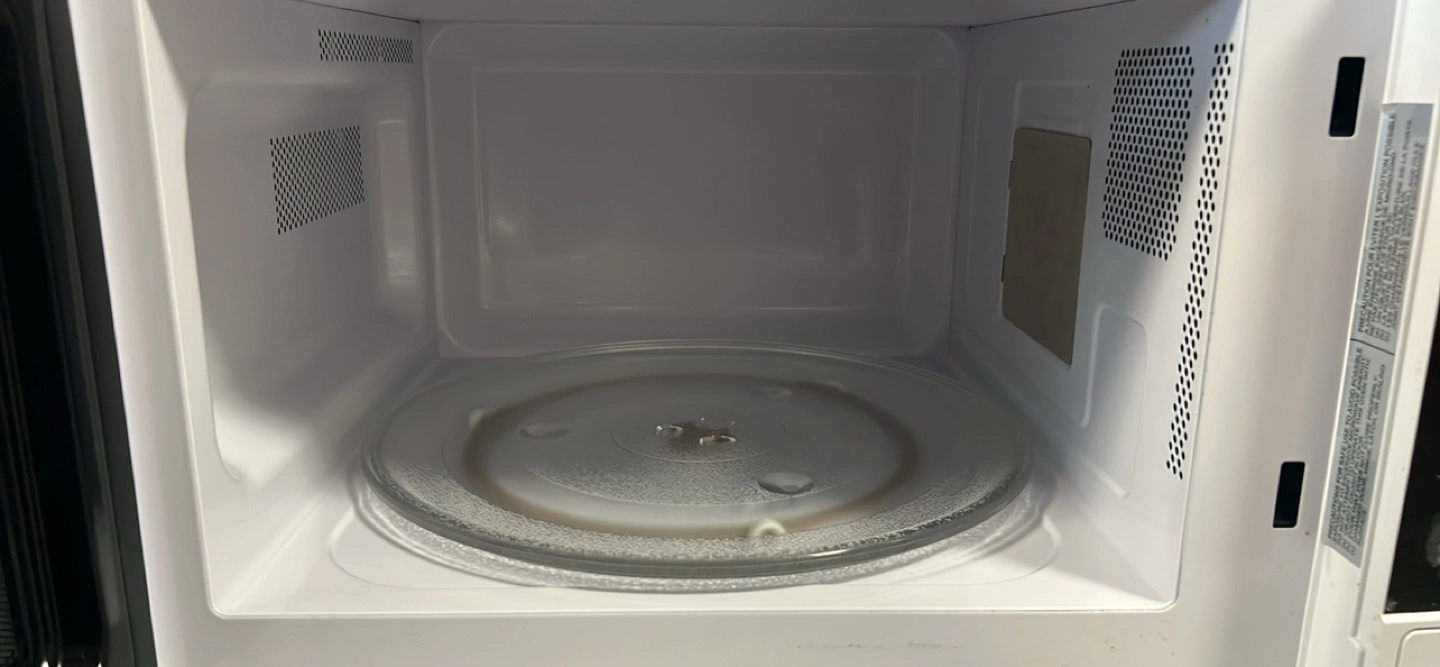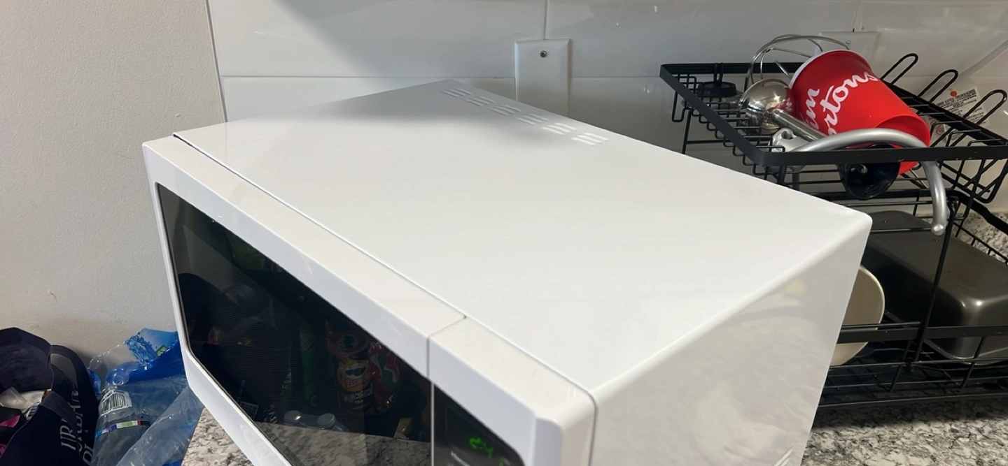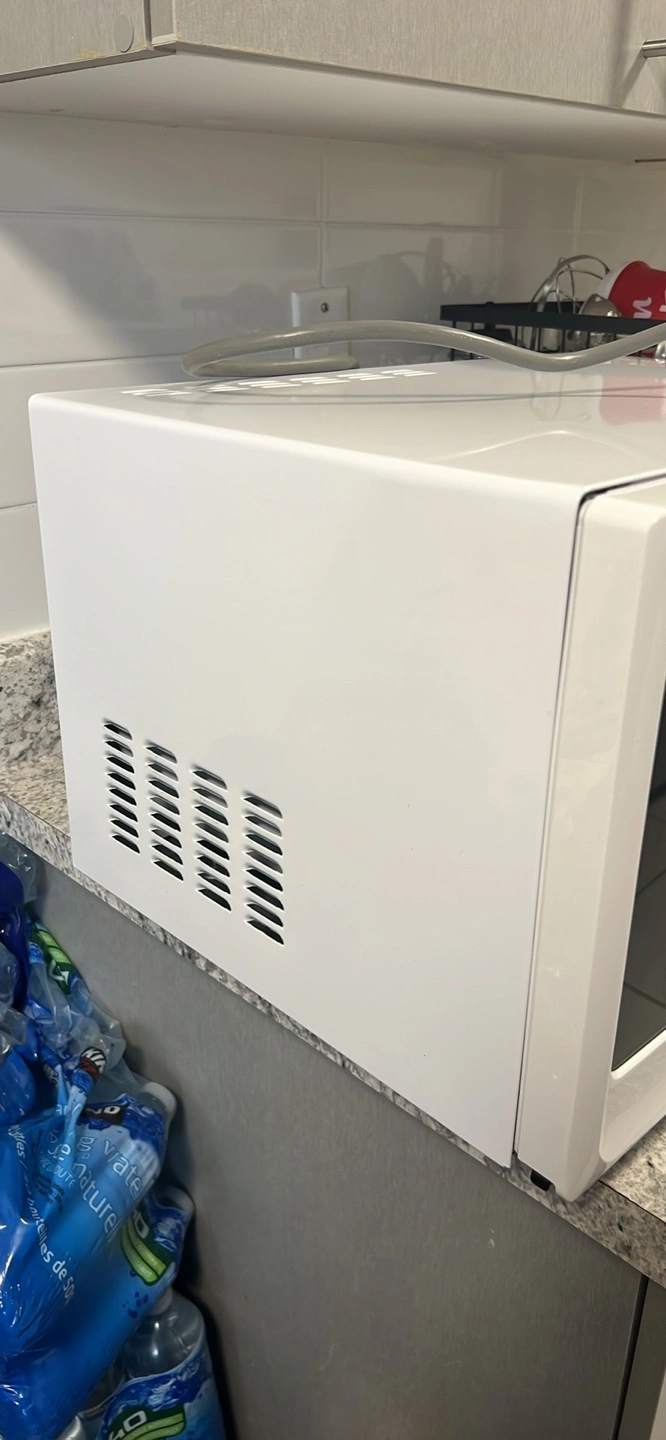 Compact microwave. White exterior. Simple controls. Used it for 4 months but husband bought it in a different colour