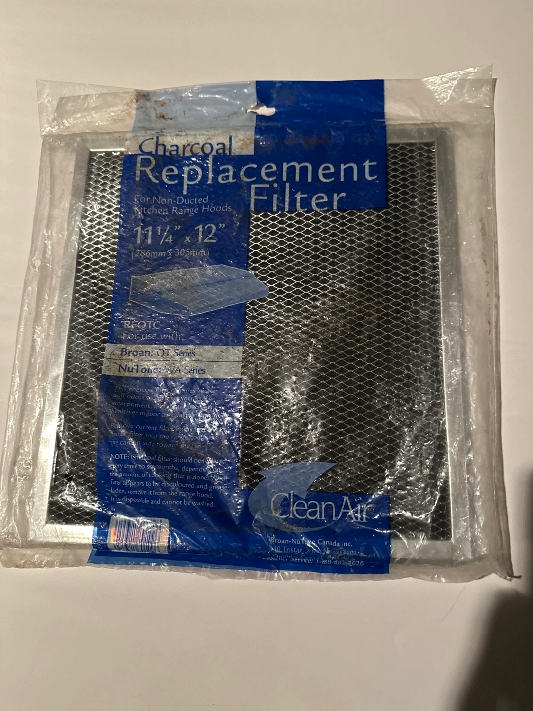 Charcoal filter for non-ducted kitchen range hoods. Measures 11 1/4" x 12". For Broan OT Series and NuTone WA Series. Disposable and cannot be washed. Bag is stained.