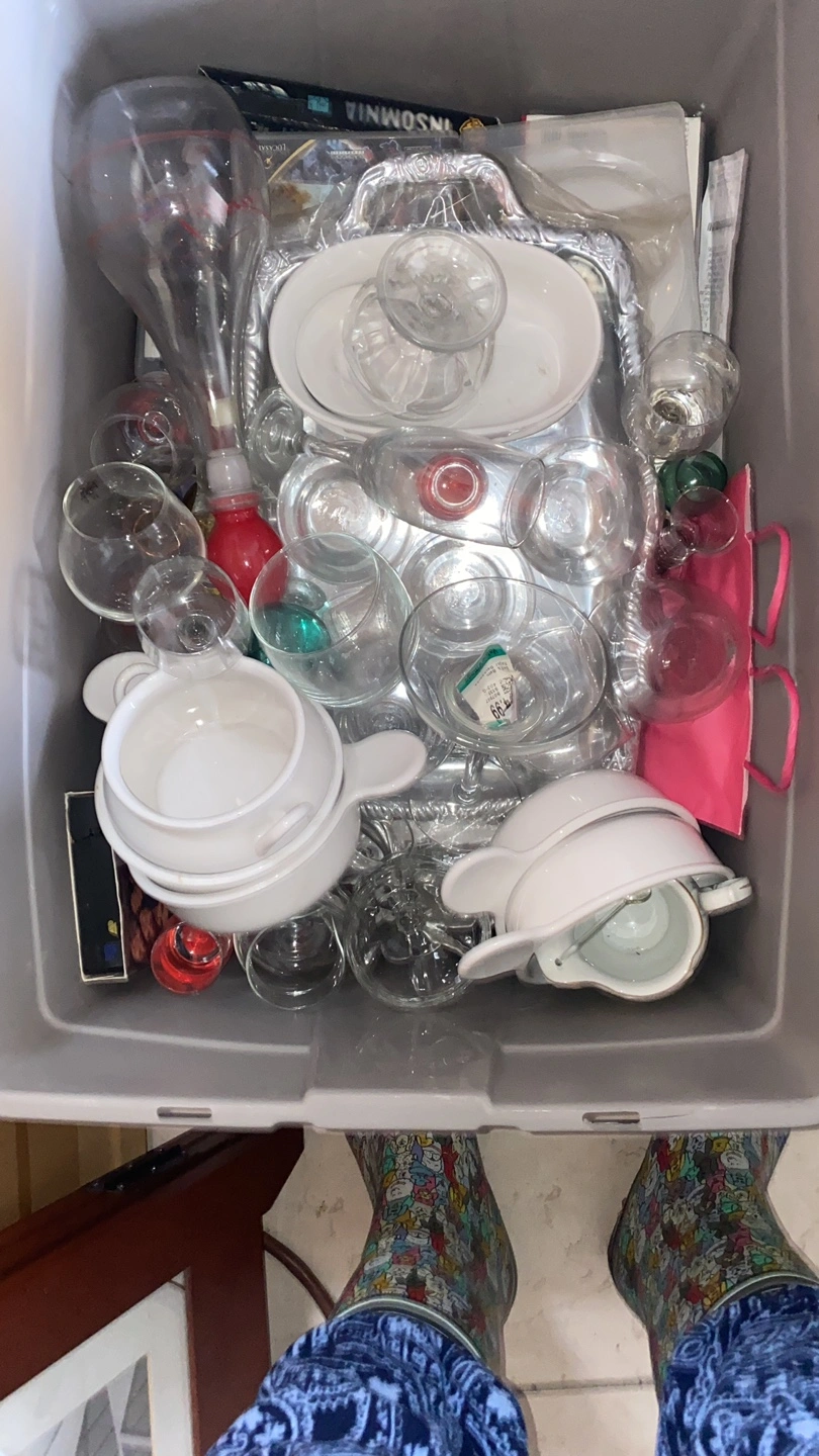 Assorted glassware, including glasses, bowls, and a decanter. Also includes a silver serving tray and white ramekins. All items are pre-owned.