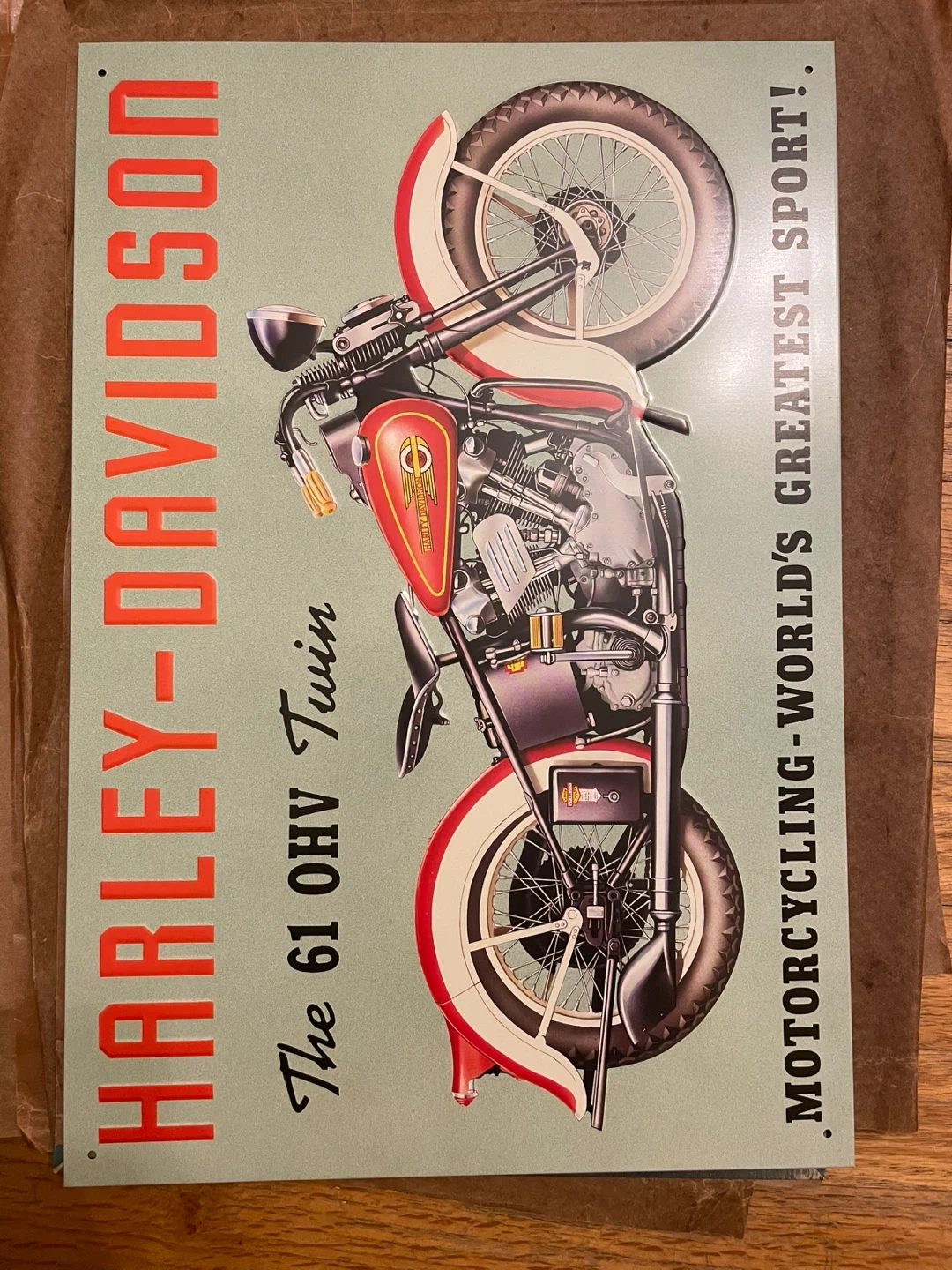 Selling a Harley-Davidson "The 61 OHV Twin" metal sign. It's a great piece for any motorcycle enthusiast or collector! The sign features a classic Harley-Davidson motorcycle design. Made in Great Britain, 1994