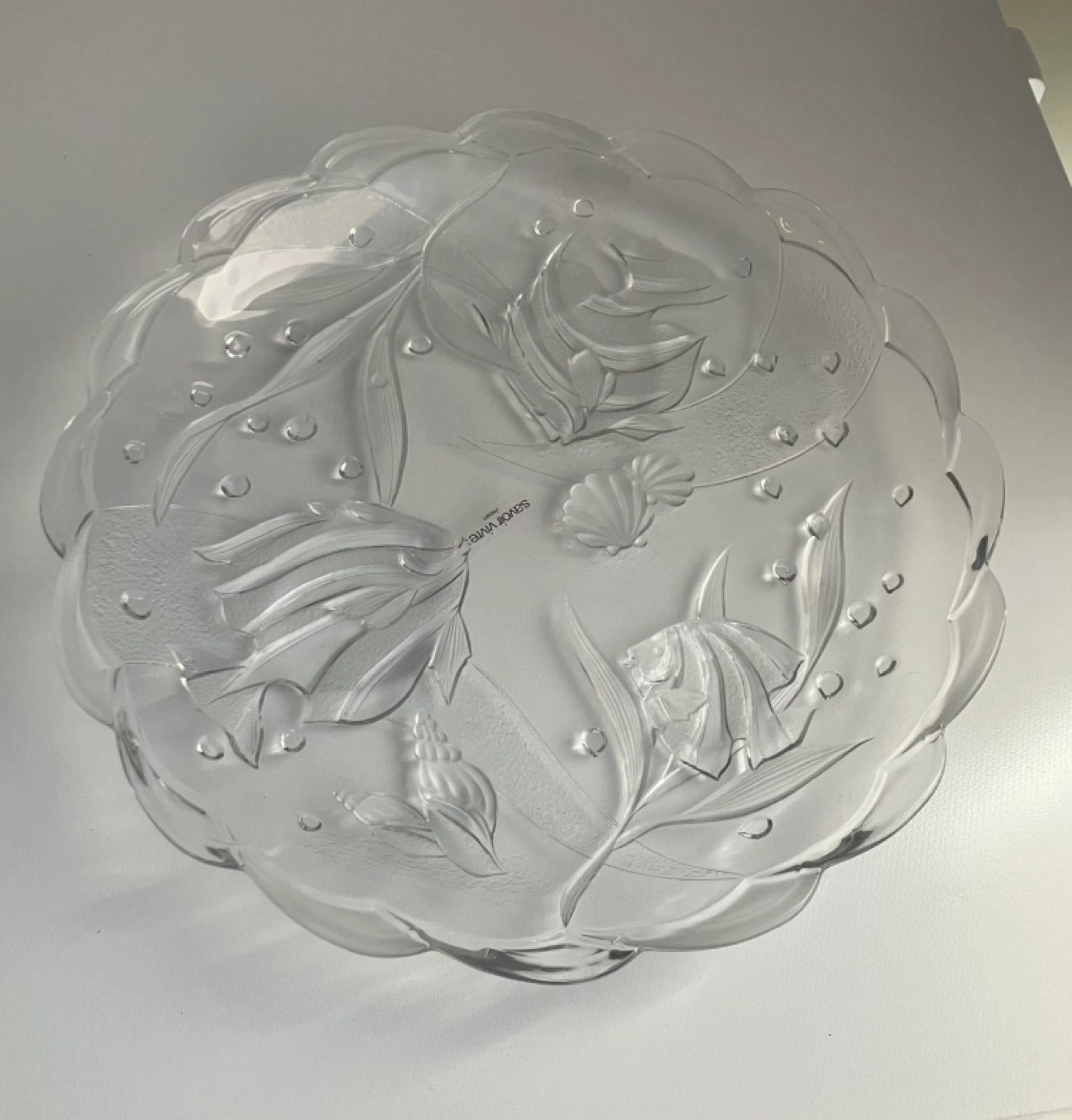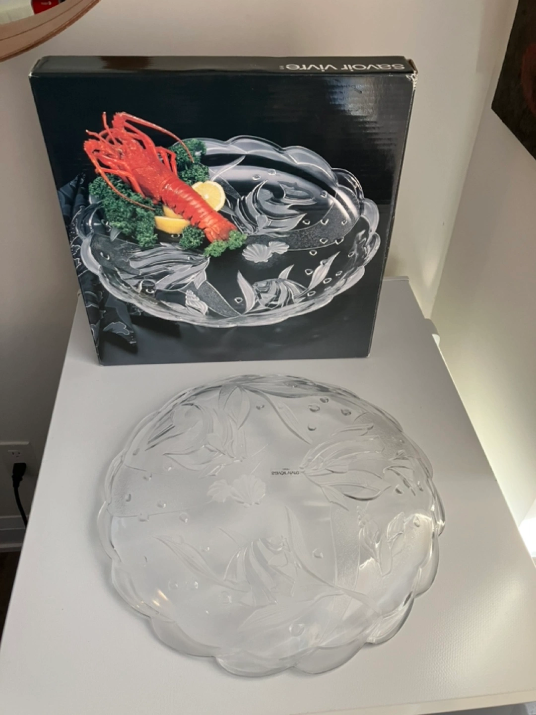 Brand new Elegant clear glass serving platter. Features an etched design of fish and seashells. Comes in original box. Measures approximately 15 inches / 38cm in diameter. ( made in Japan)