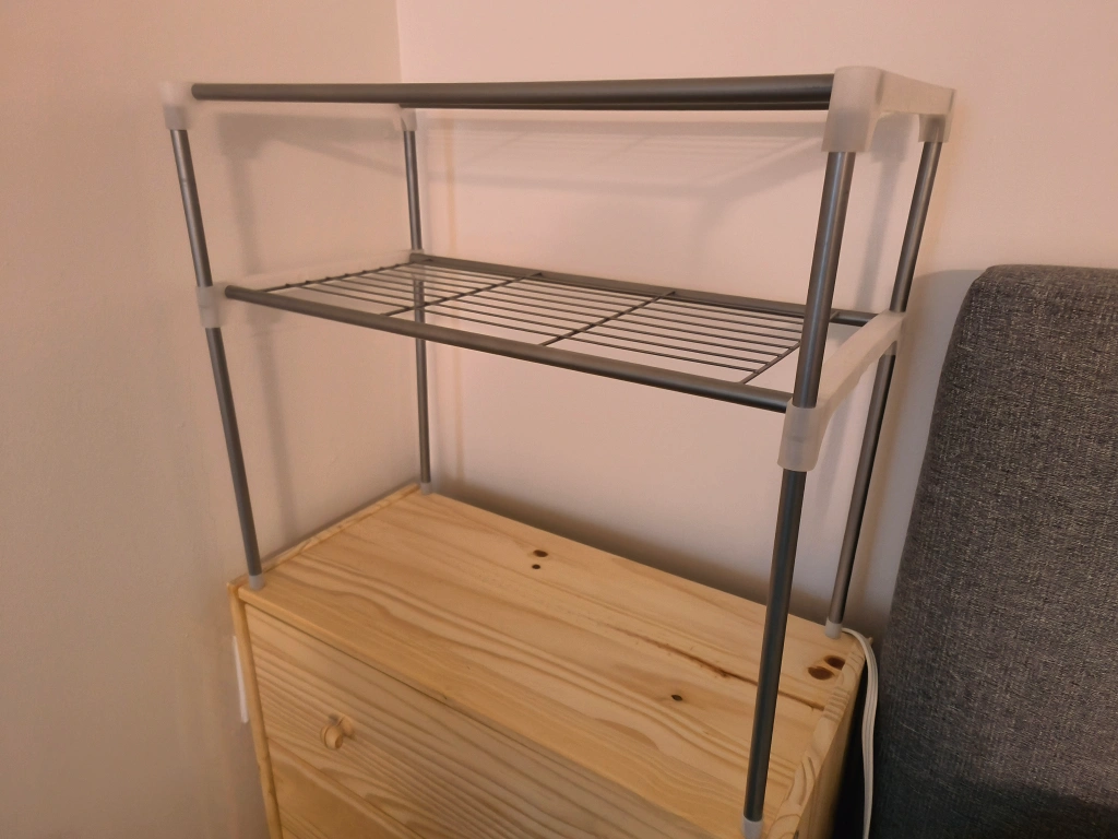 Space-saving two-tier shelf unit. Metal wire shelves. Grey metal frame. White plastic feet. Easy assembly. Perfect for kitchen or pantry organization.