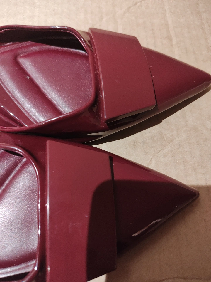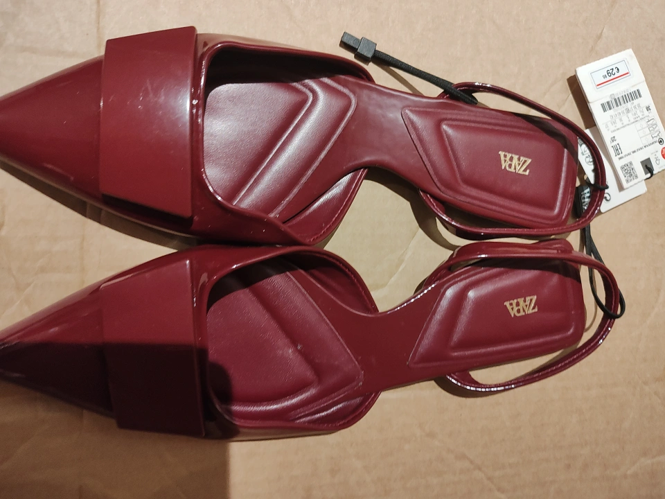 Gorgeous burgundy patent leather flats. Pointed-toe design. Slingback style with ankle strap. New with tags.