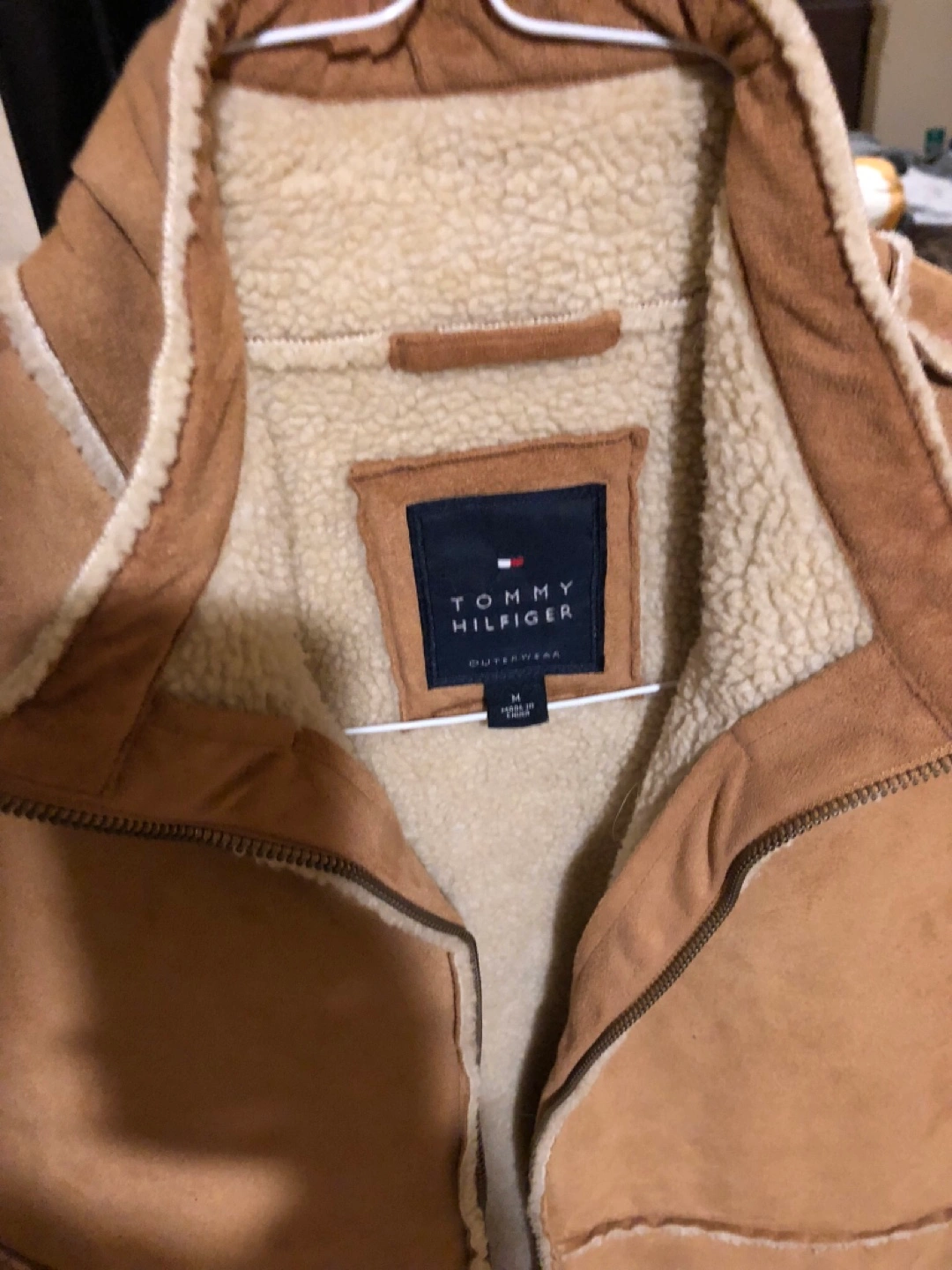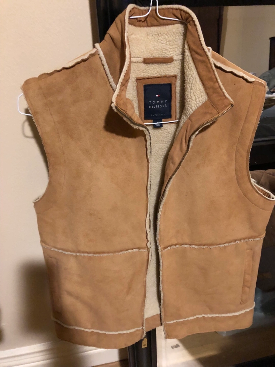 Never worn new Men's brown suede vest. Zip-up closure. Sherpa lining. Size medium. Two pockets.