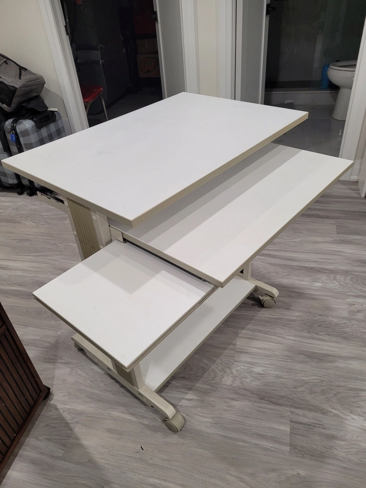 Three-tiered rolling computer desk. White laminate top and beige metal frame. Keyboard tray included. Excellent for small spaces. Computer cart in great condition. It has a keyboard tray and side mouse tray too. Currently its disassembled for easy transportation