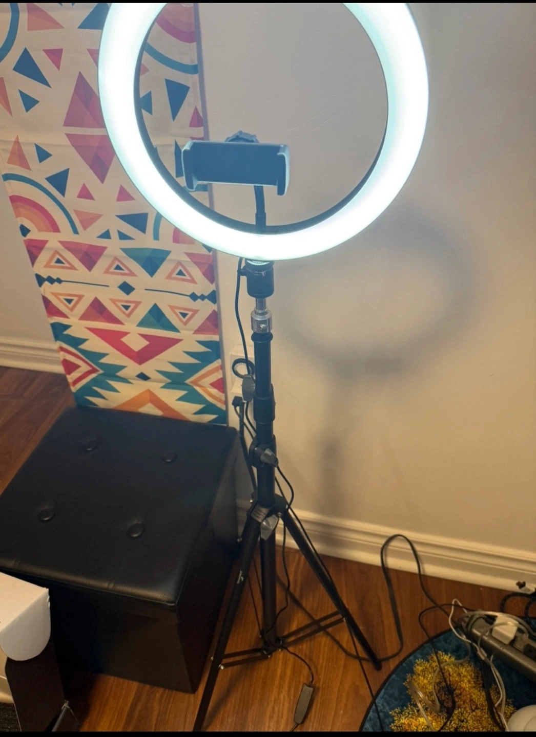 Convenient portable stand. Easily adjust height from 3.9ft to 6.8ft. Choose from 3 brightness options: Warm White and Soft White. 11 adjustable colours. 360° adjustable ring light. Phone holder included. Tripod folds for storage. control switch . ( Two left )