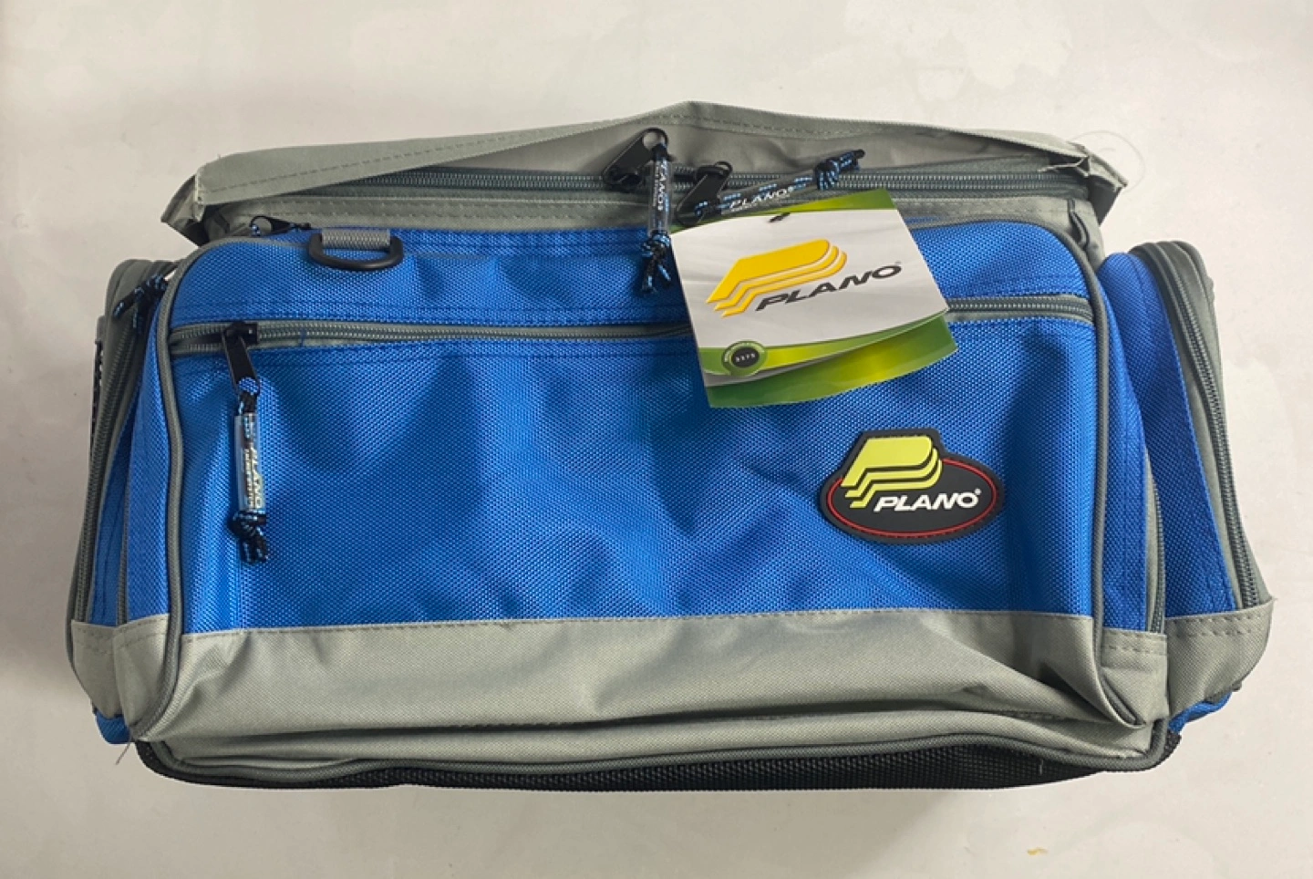 Blue and grey fishing tackle bag. Multiple compartments and includes several clear Plano storage boxes. Great for organizing fishing lures and equipment. Size 17x10 inches