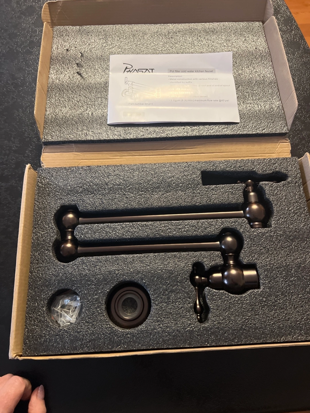 Brand new in box. Oil rubbed bronze finish. Metal construction. Includes all parts and instructions. Single hole wall mount. 1/2" IPS connection.