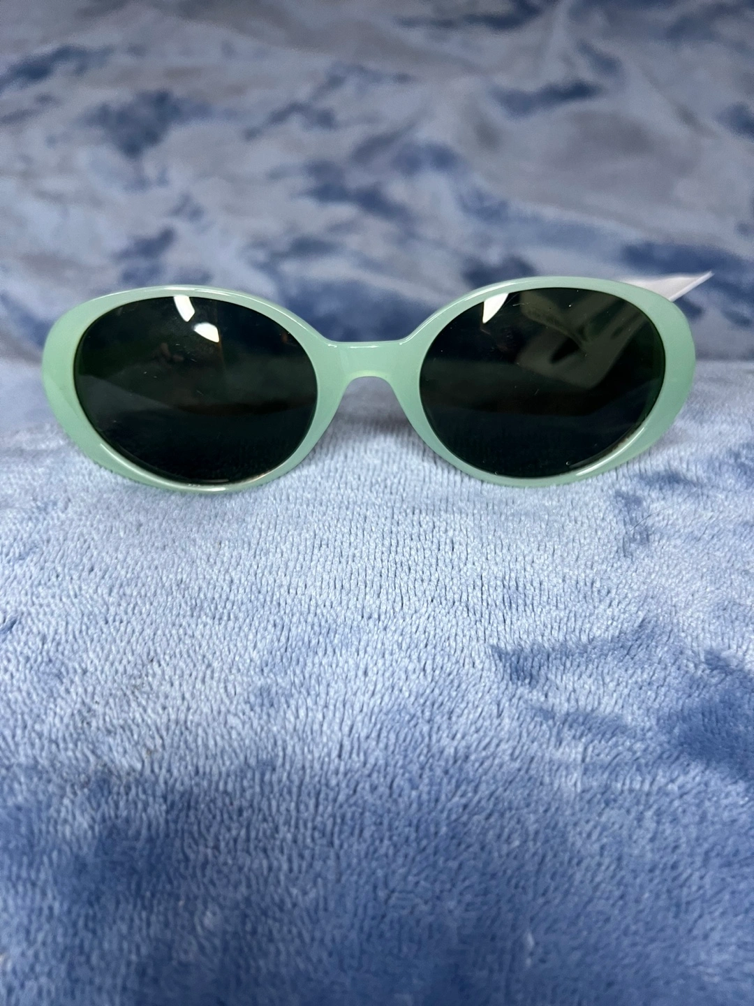 Round sunglasses, mint green frames, dark lenses. Great for summer.