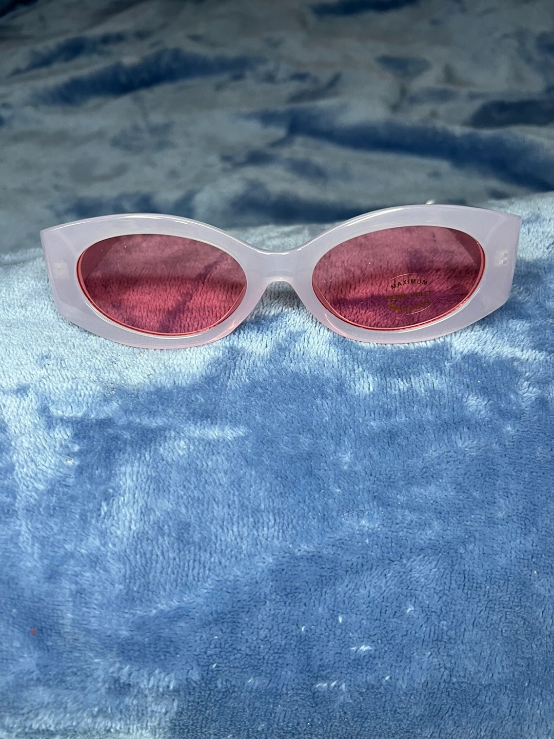 White plastic frame sunglasses. Pink lenses. Maximum Violet.
