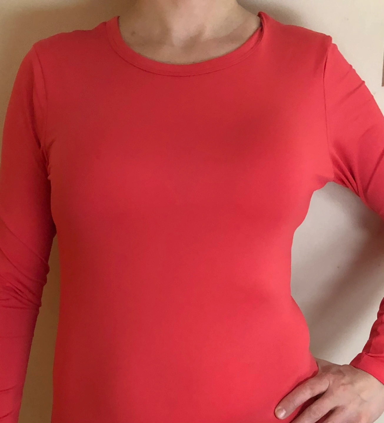 Coral coloured long sleeve crew neck jersey shirt - new with tags, size small.