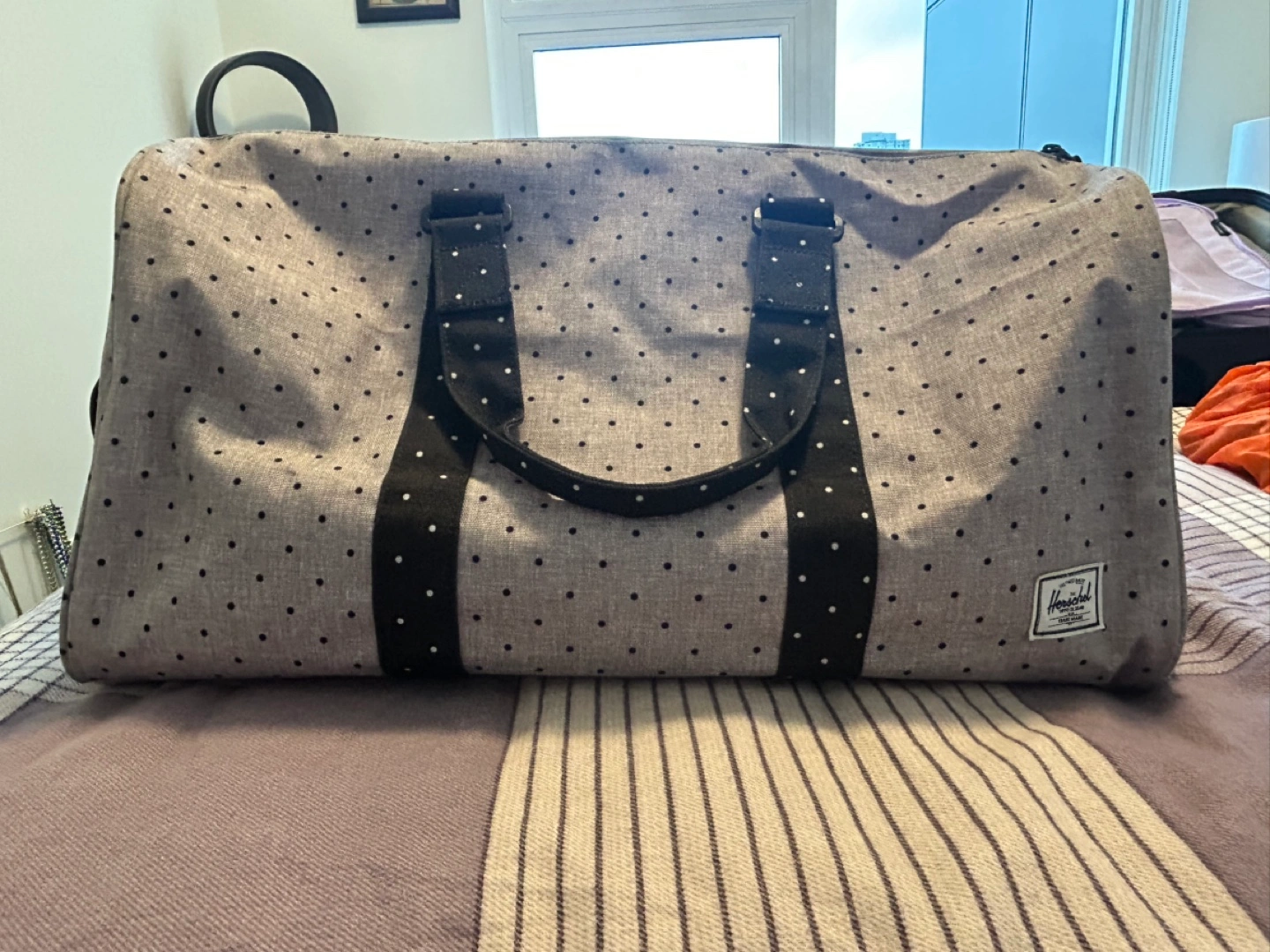 43L Novel duffle bag by Herschel. Polka dot pattern with black accents and interior red stripes. Removable padded shoulder strap. Interior zippered pocket with shoe compartment. Great for travel or the gym.