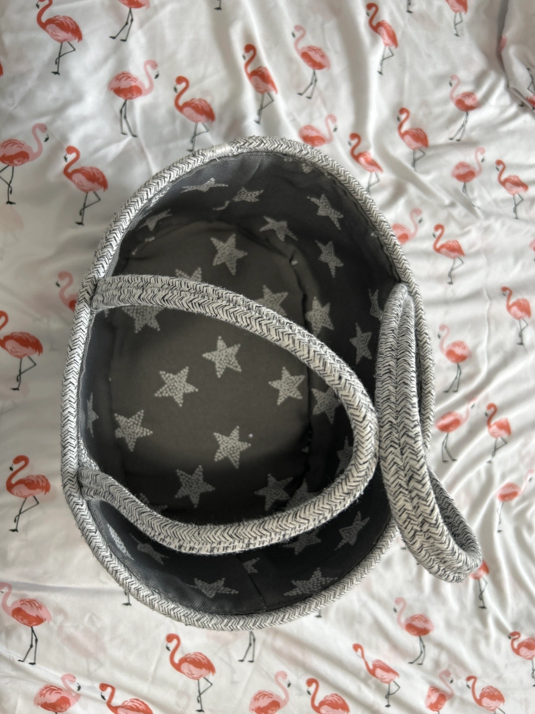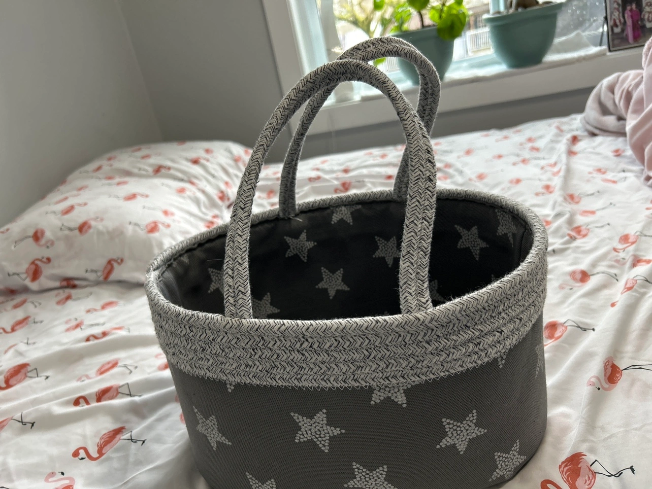 158Cute grey storage basket. Features a star print and two fabric handles. Perfect for organizing toys, toiletries or other small items.
