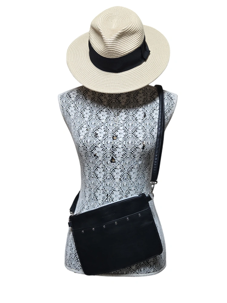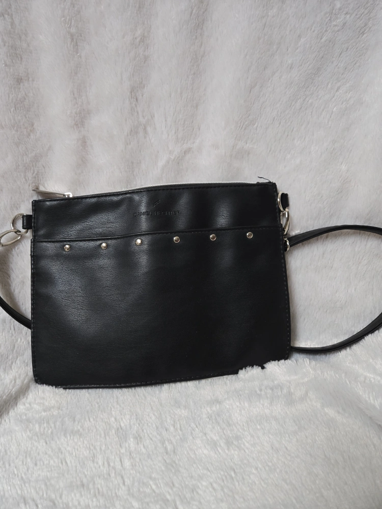 Black crossbody bag. Features a zip closure, adjustable strap, and metal accents. Small interior pockets. Excellent for everyday use.