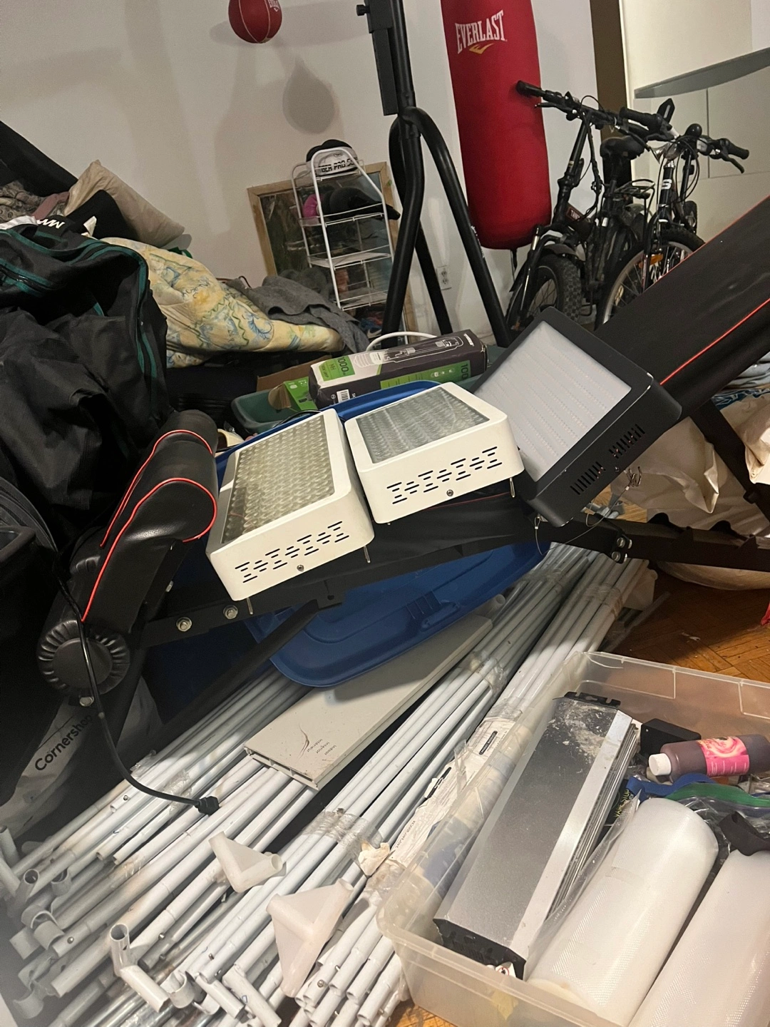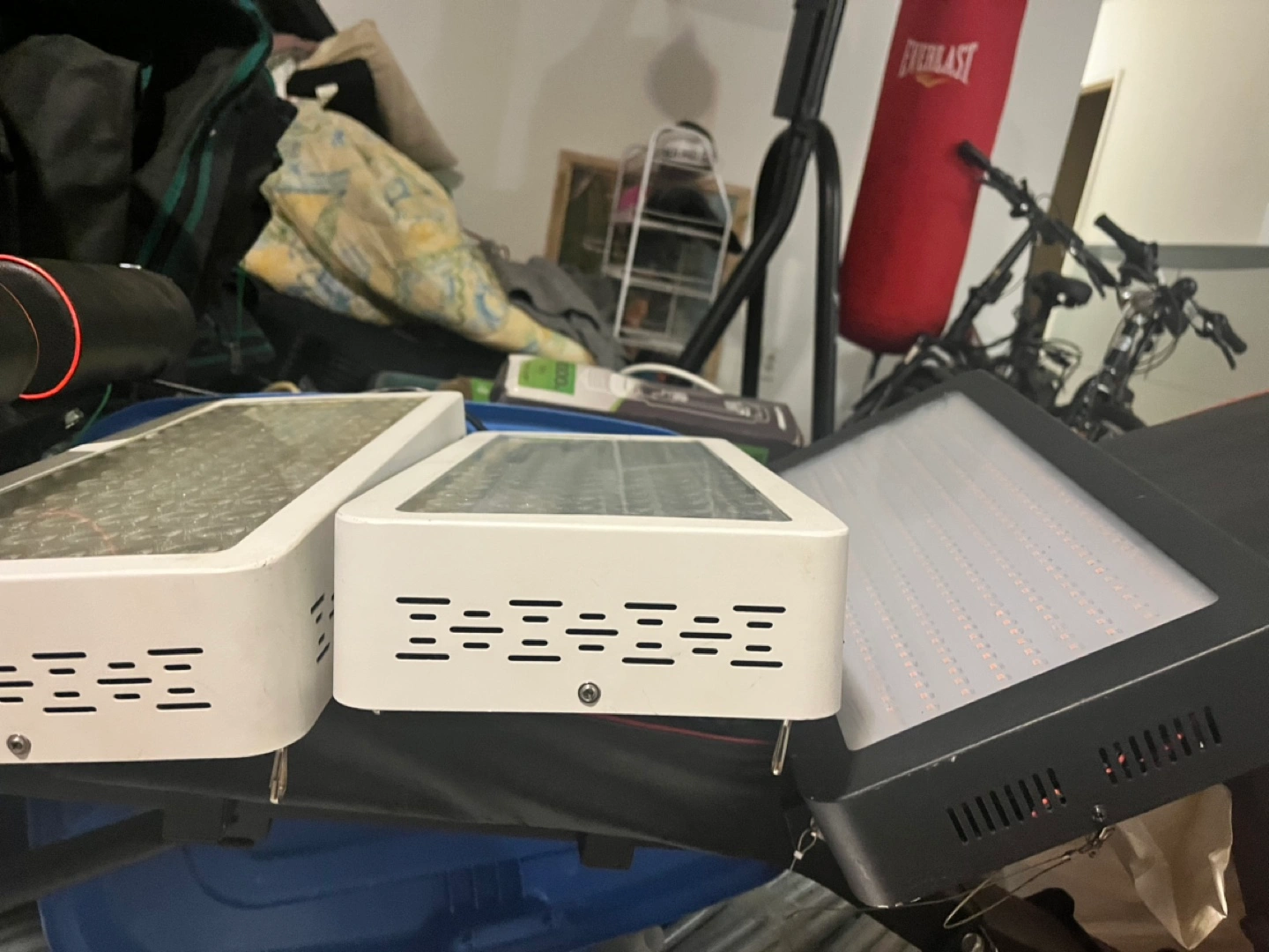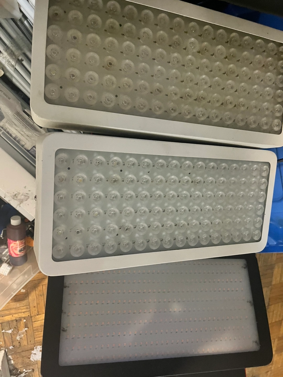 Three LED grow lights, two white and one black. One contains many small individual LEDs. The others have larger, individual diodes. Also included is a UV-B light fixture with multiple tubes.