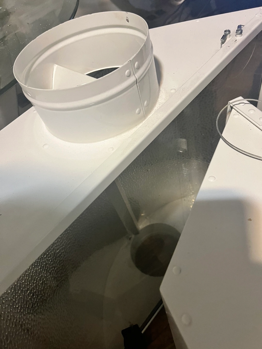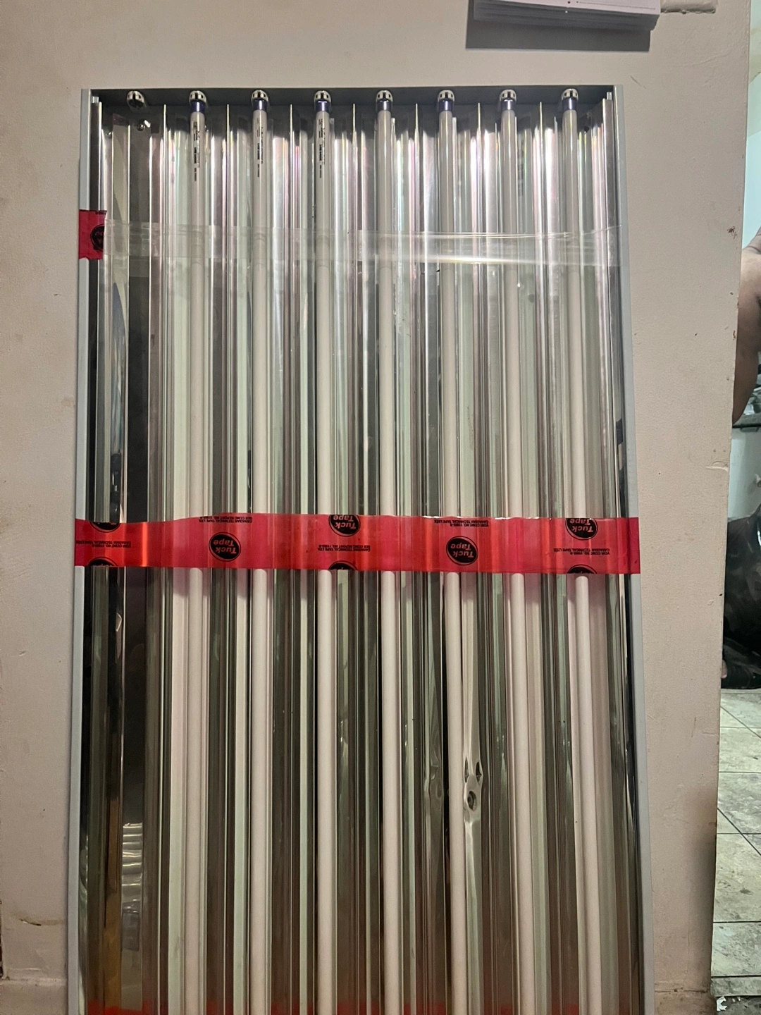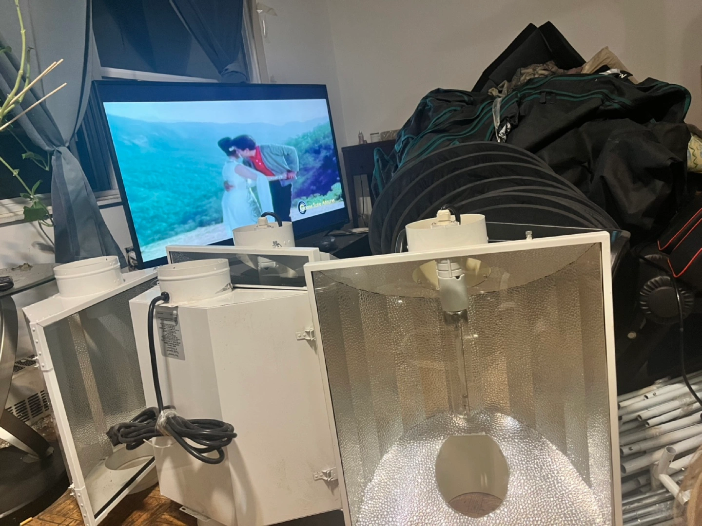 Three LED grow lights, two white and one black. One contains many small individual LEDs. The others have larger, individual diodes. Also included is a UV-B light fixture with multiple tubes.