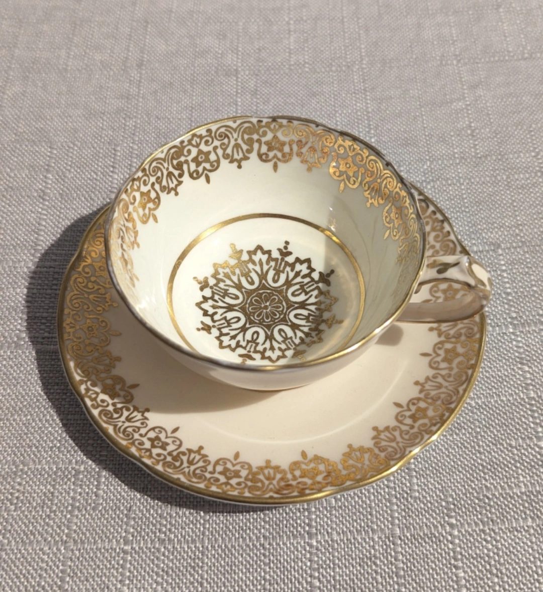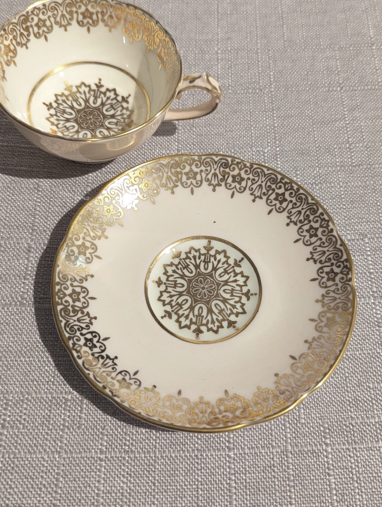 Elegant demitasse teacup and saucer set with cream colour and beautiful ornate medallion design in gold. This is the smaller demitasse size; the diameter of the saucer is 4", cup about 2.5". Made in England. No chips, cracks, or crazing. Barely any wear.