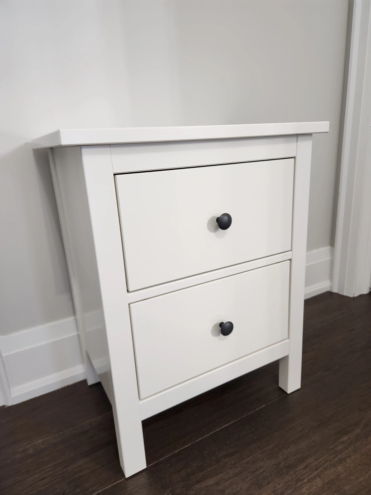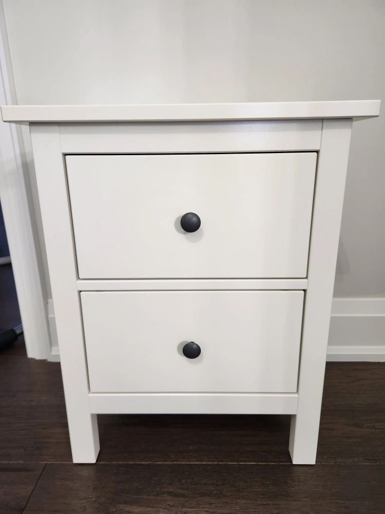 White two-drawer nightstand. Small and functional. Drawers feature grey and white striped liner. Good condition.