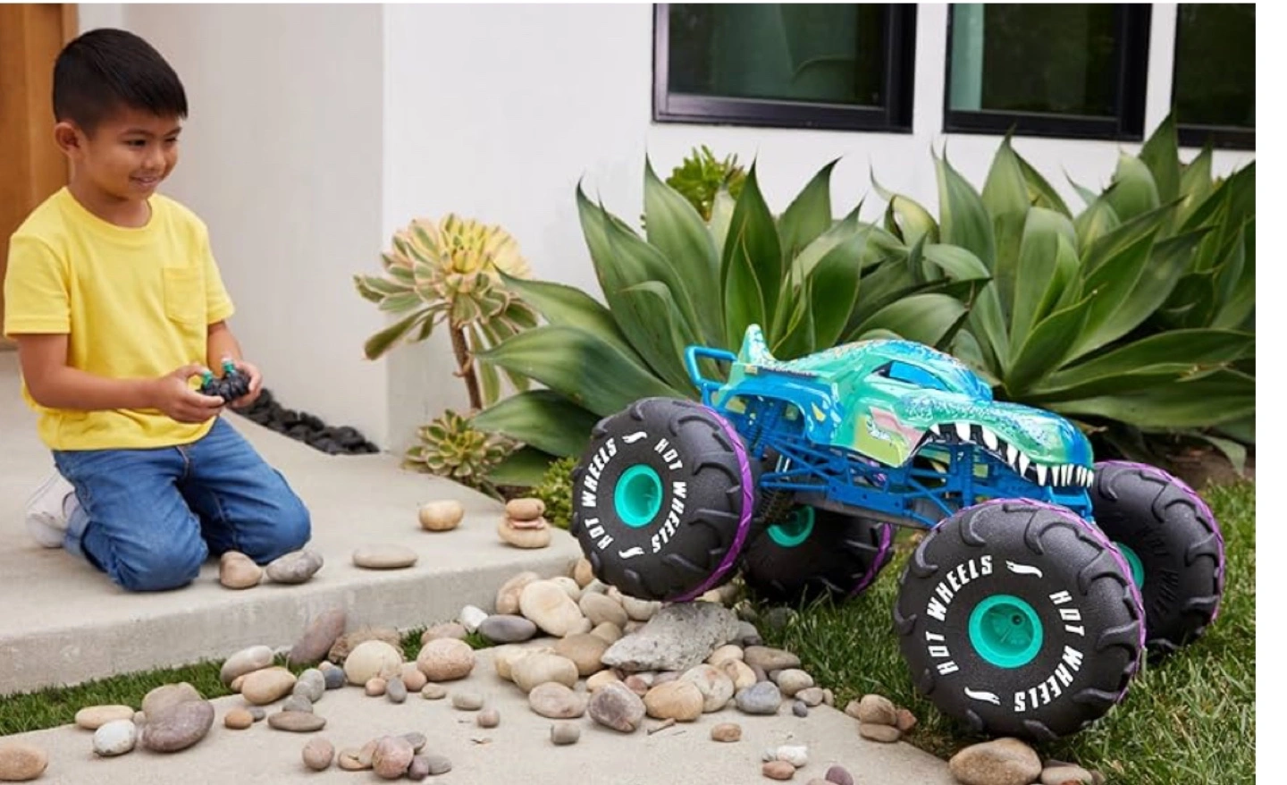 Massive 2-foot long remote control monster truck. Full-function remote. Great for indoor or outdoor play. Features large, durable tires.