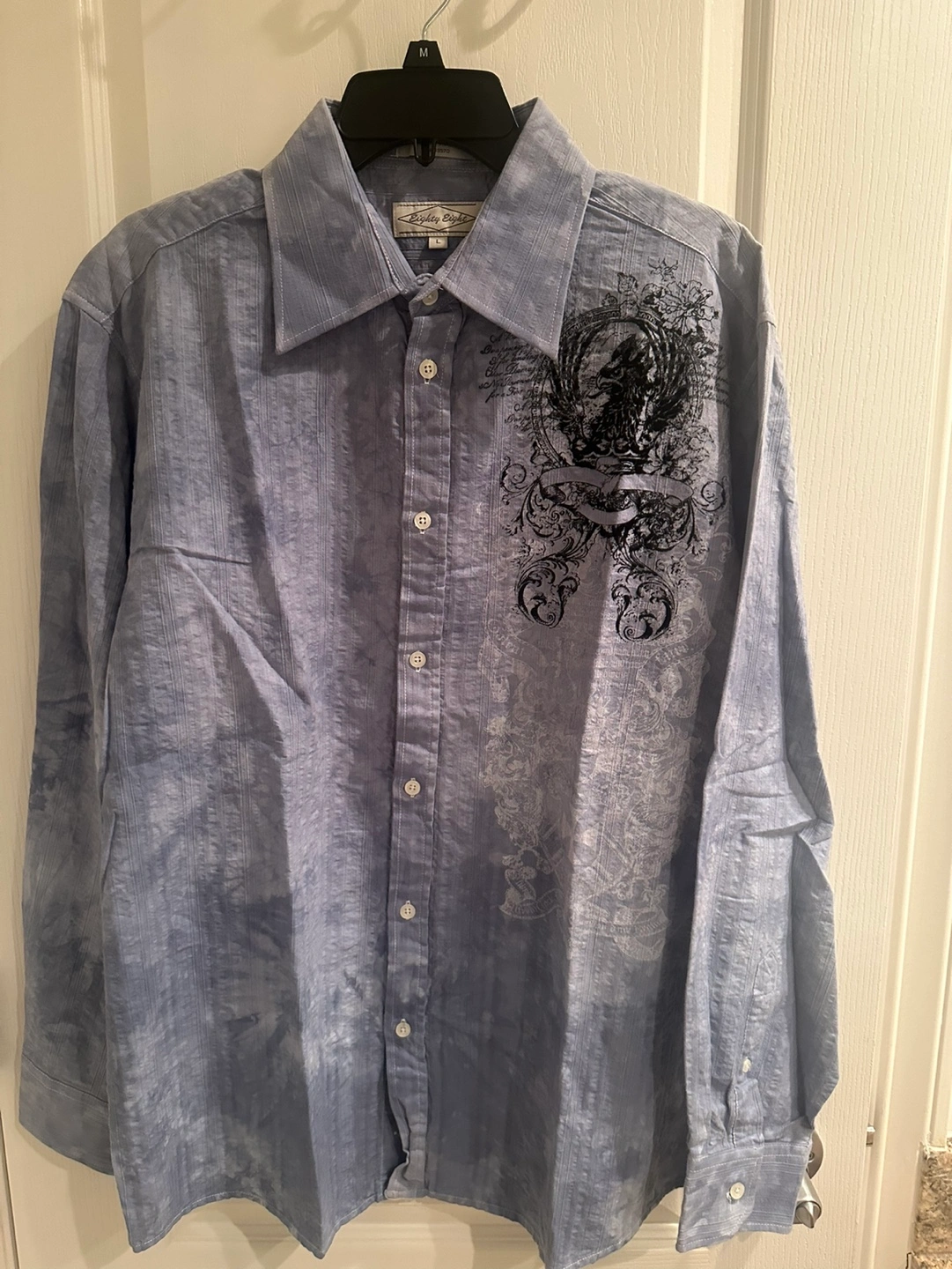 Men's long sleeve button-down shirt. Size large. 100% cotton. Features an ornate graphic on the front and back. Light blue color.