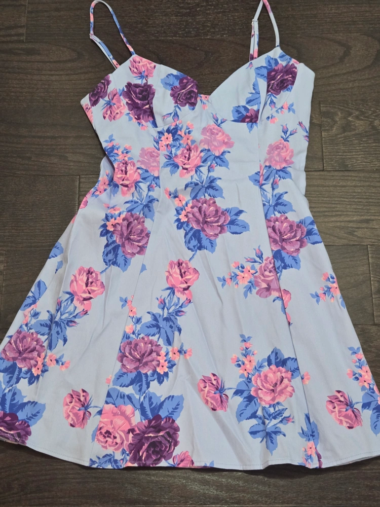 677Light blue floral sundress. Features spaghetti straps and a fitted bodice. A-line skirt. Perfect for warm weather.