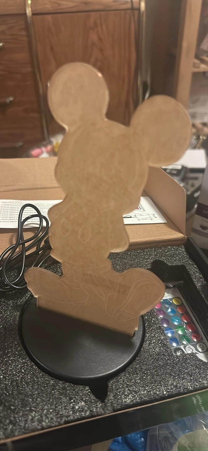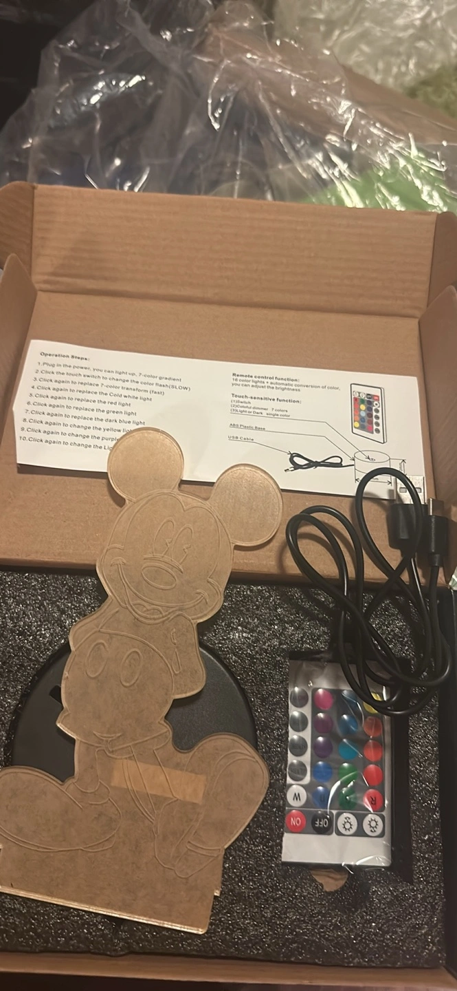 Cute Mickey Mouse 3D illusion night light. Features colour changing LEDs and remote control. USB powered. New in box.