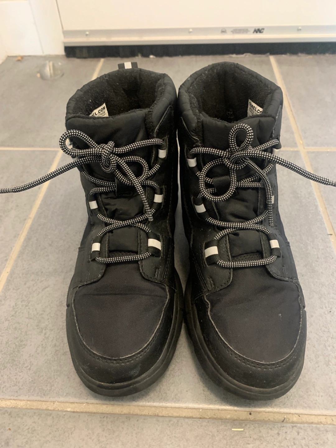 Black Sorel winter boots for kids or women. Lace-up style. Good for snow and cold weather. Size 6.5.