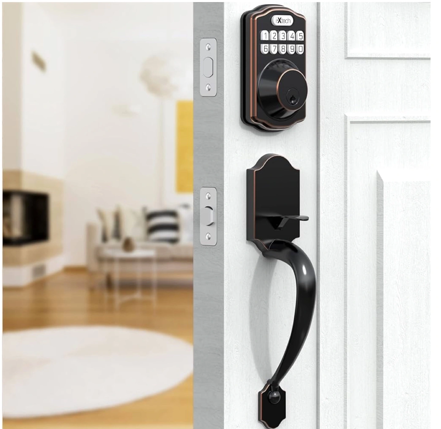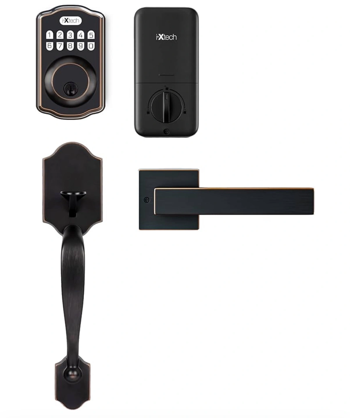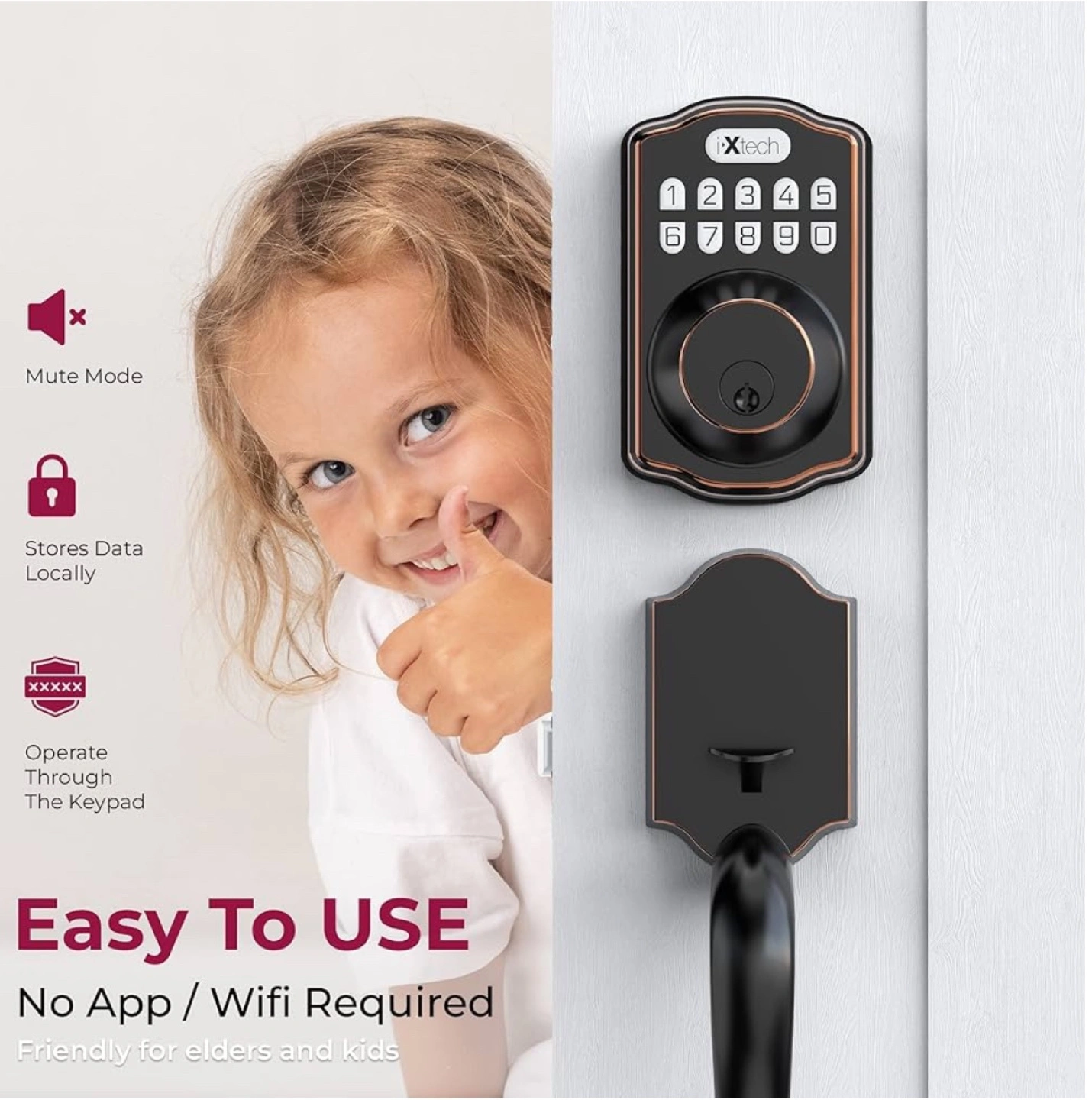 Easy to use keypad door lock. No app or Wifi required. Stores data locally. Oil rubbed bronze finish. Includes keypad, door handle and interior lever.