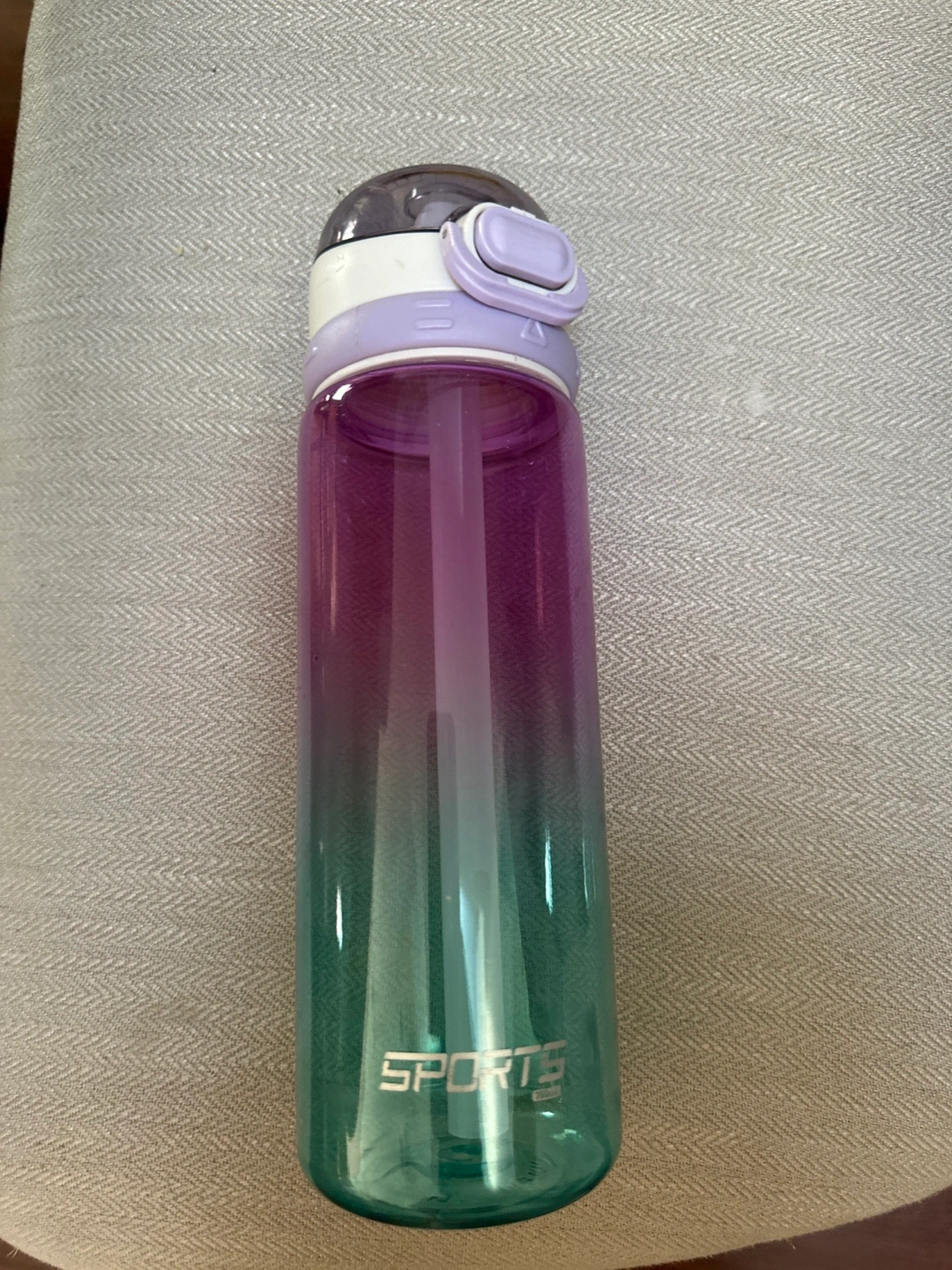 Reusable water bottle. Features a flip-top lid and built-in straw. Colour gradient from purple to teal. Great for hydration on the go.