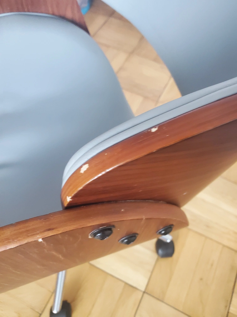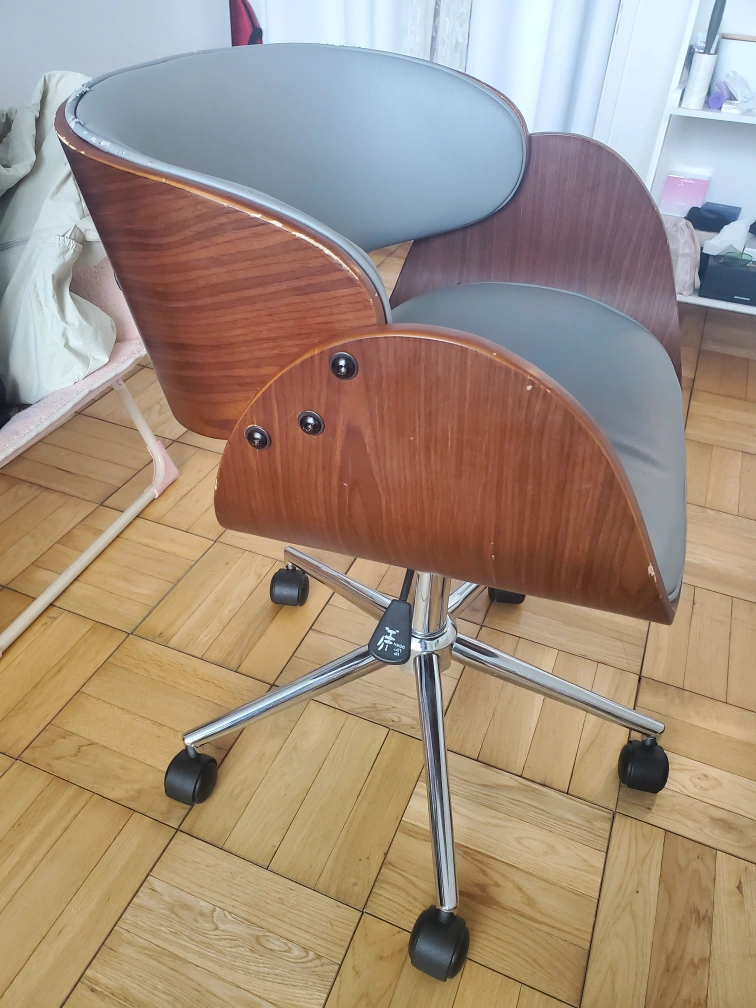 Stylish office chair. Gray cushioned seat and back. Walnut wood frame. Chrome base with five casters. Minor wear.