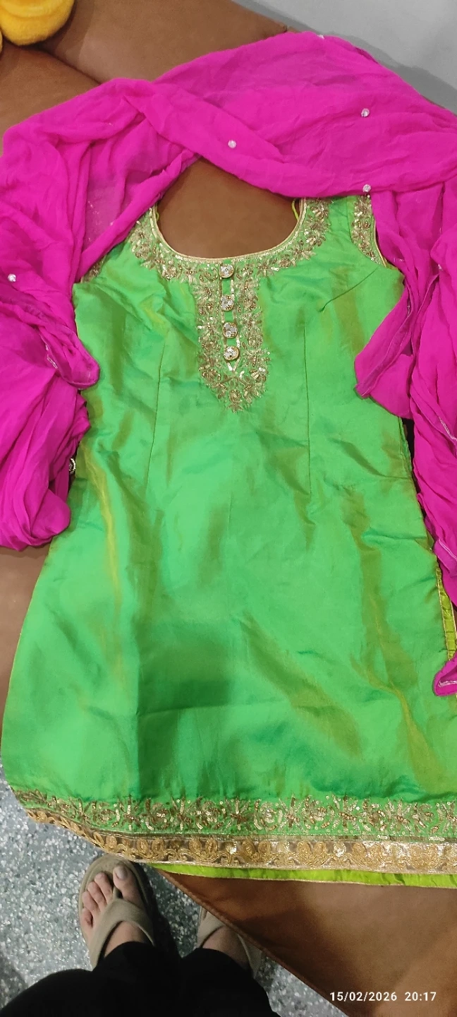 This is a vibrant green salwar kameez set. It's adorned with intricate gold embroidery and sequins around the neckline and hem. A bright pink dupatta complements the outfit. Material is silk.